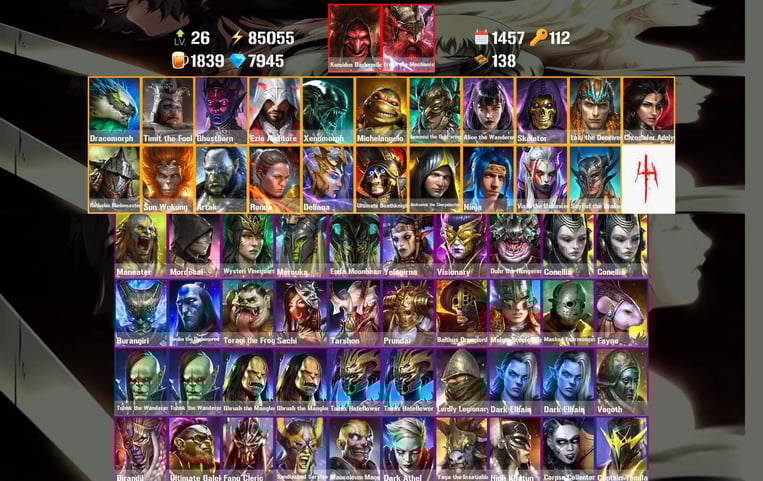 1536 Days 91.2k Energy [Mythical Starter] Nell Blackteeth ⸱ Galleus Bloodcrest ⸱ Mezomel Luperfang ⸱ Kalvalax ⸱ Sicia Flametongue ⸱ Robar ⸱ Ezio Auditore ⸱ Xenomorph ⸱ Seeker ⸱ Seer ⸱ 59.6m Silver ⸱ 7.6k Gems