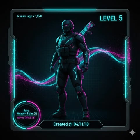 🎮 PC/XBOX/PSN | ⭐ Level 5 | 💎 Rare: Waves (SPAS-15) | 💰 1,990 Renown | 📅 Created 2018 (6 Years Old)