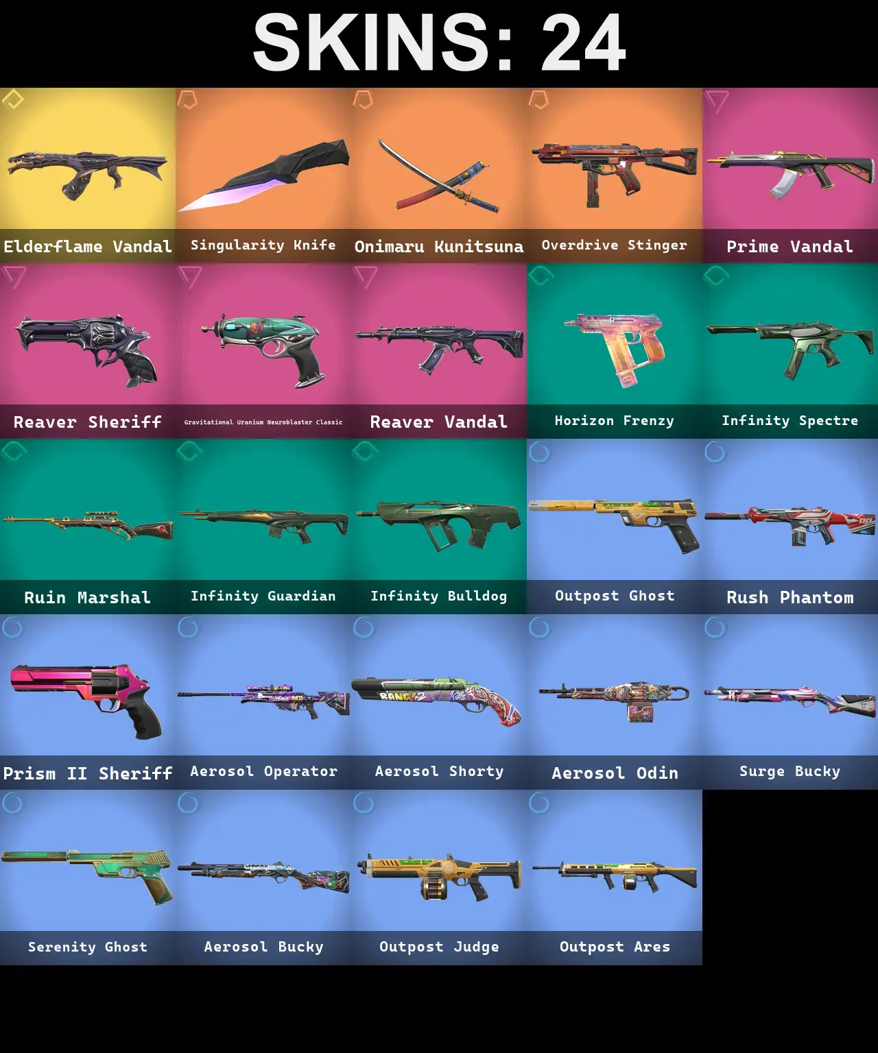 24 SKINS | 2 KNIFE | RUIN MARSHAL | ELDERFLAME VANDAL | OVERDRIVE STINGER | REAVER VANDAL | REAVER SHERIFF | PRIME VANDAL | GRAVITATIONAL URANIUM NEUROBLASTER CLASSIC | ONIMARU KUNITSUNA | SINGULARITY KNIFE | HORIZON FRENZY | INFI