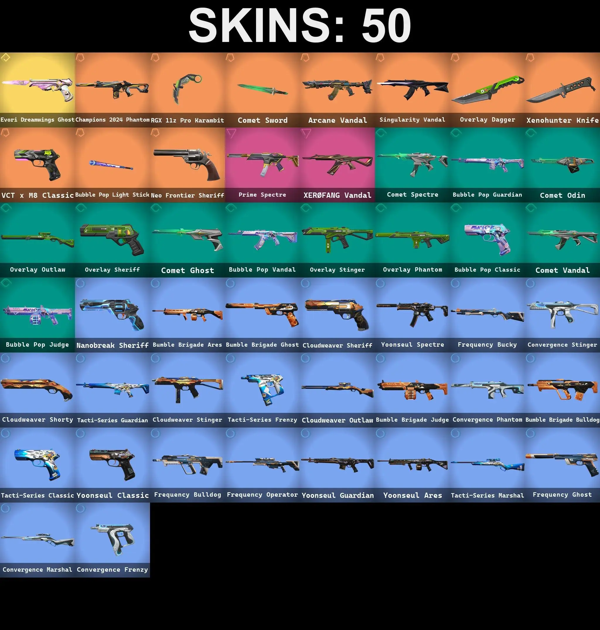 50 SKINS | 5 KNIFE | CHAMPIONS 2024 PHANTOM | VCT X M8 CLASSIC | RGX 11Z PRO KARAMBIT | NEO FRONTIER SHERIFF | EVORI DREAMWINGS GHOST | XEROFANG VANDAL | XENOHUNTER KNIFE | PRIME SPECTRE | SINGULARITY VANDAL | COMET SWORD | COMET