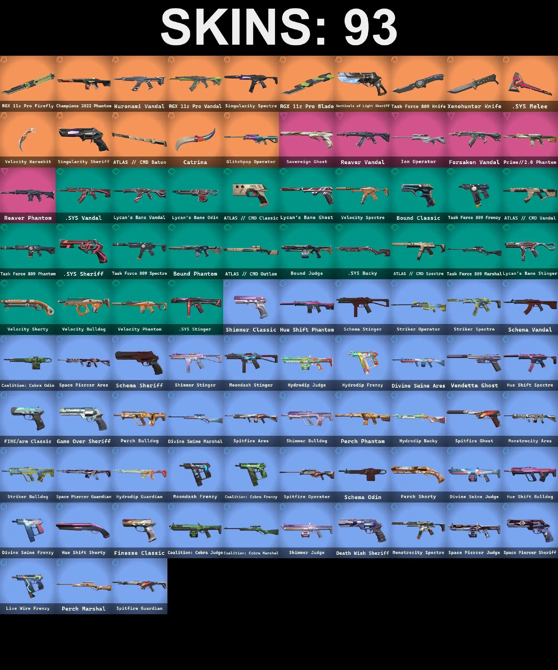 93 SKINS | 8 KNIFE | CHAMPIONS 2022 PHANTOM | KURONAMI VANDAL | RGX 11Z PRO VANDAL | RGX 11Z PRO FIREFLY | RGX 11Z PRO BLADE | GLITCHPOP OPERATOR | XENOHUNTER KNIFE | REAVER VANDAL | REAVER PHANTOM | SOVEREIGN GHOST | PRIME//2.0 P