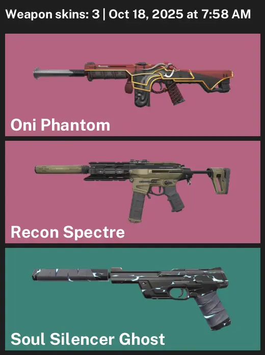 🏒 AP 😆 Unranked 📲 3 Skins 🪷 79 VP 🍝 14 Agents ⛈ Value: 3550 VP 🦞 Oni Phantom 📗 Recon Spectre 🐻❄️ Soul Silencer Ghost