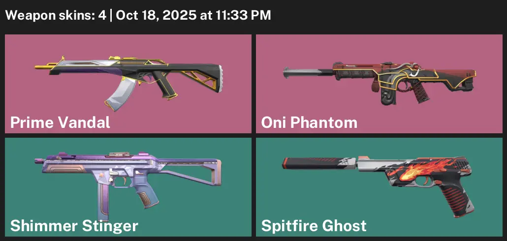 🪖 AP 🗡 Unranked 🧣 4 Skins 😀 375 VP 🌭 1 Agents 📍 Value: 3550 VP 🐦 Prime Vandal 😂 Oni Phantom 🎫 Shimmer Stinger 🪅 Spitfire Ghost