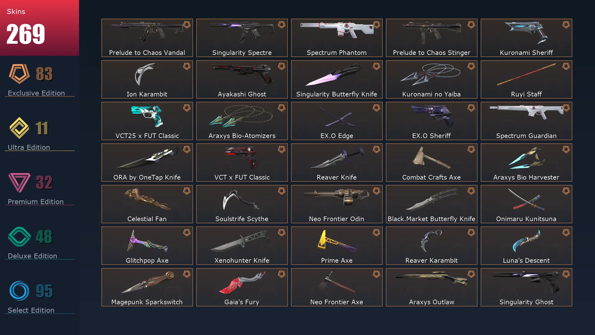 EU 💺 269 Skins 🥚 Platinum 3 😡 29 Agents 👾 287 Level 🎸 Champions 2024 Phantom 🍲 Arcane Vandal 📆 Champions 2023 Vandal 😎 Champions 2023 Kunai 🍳 Champions 2024 Blade 🛏 Arcane Gauntlets 🌭 Ignite Fan 🔫 Gaia's Vengeance Ghost