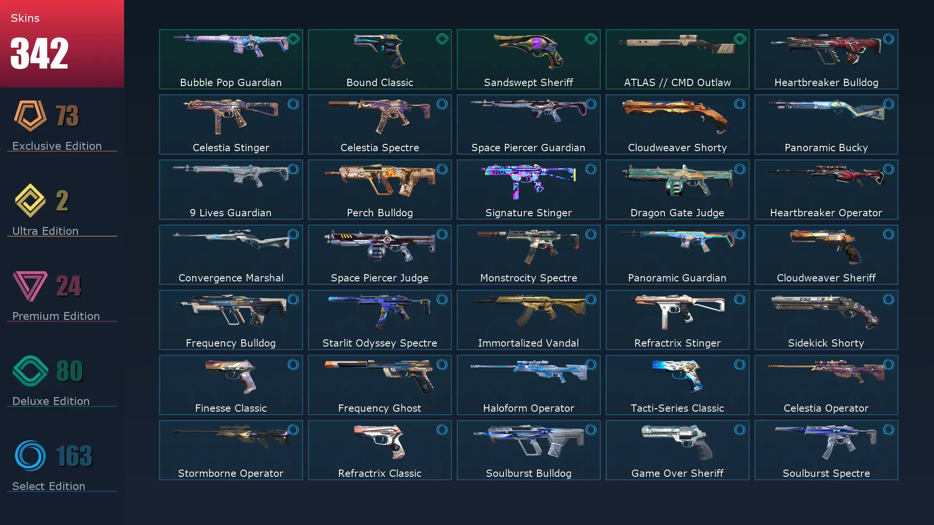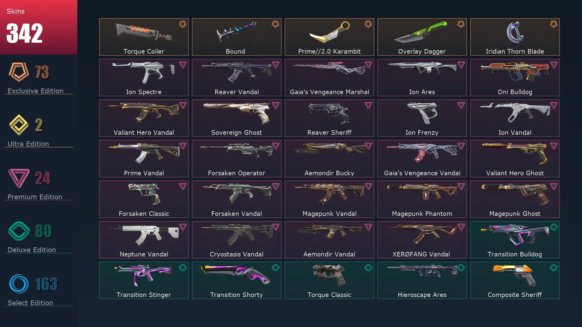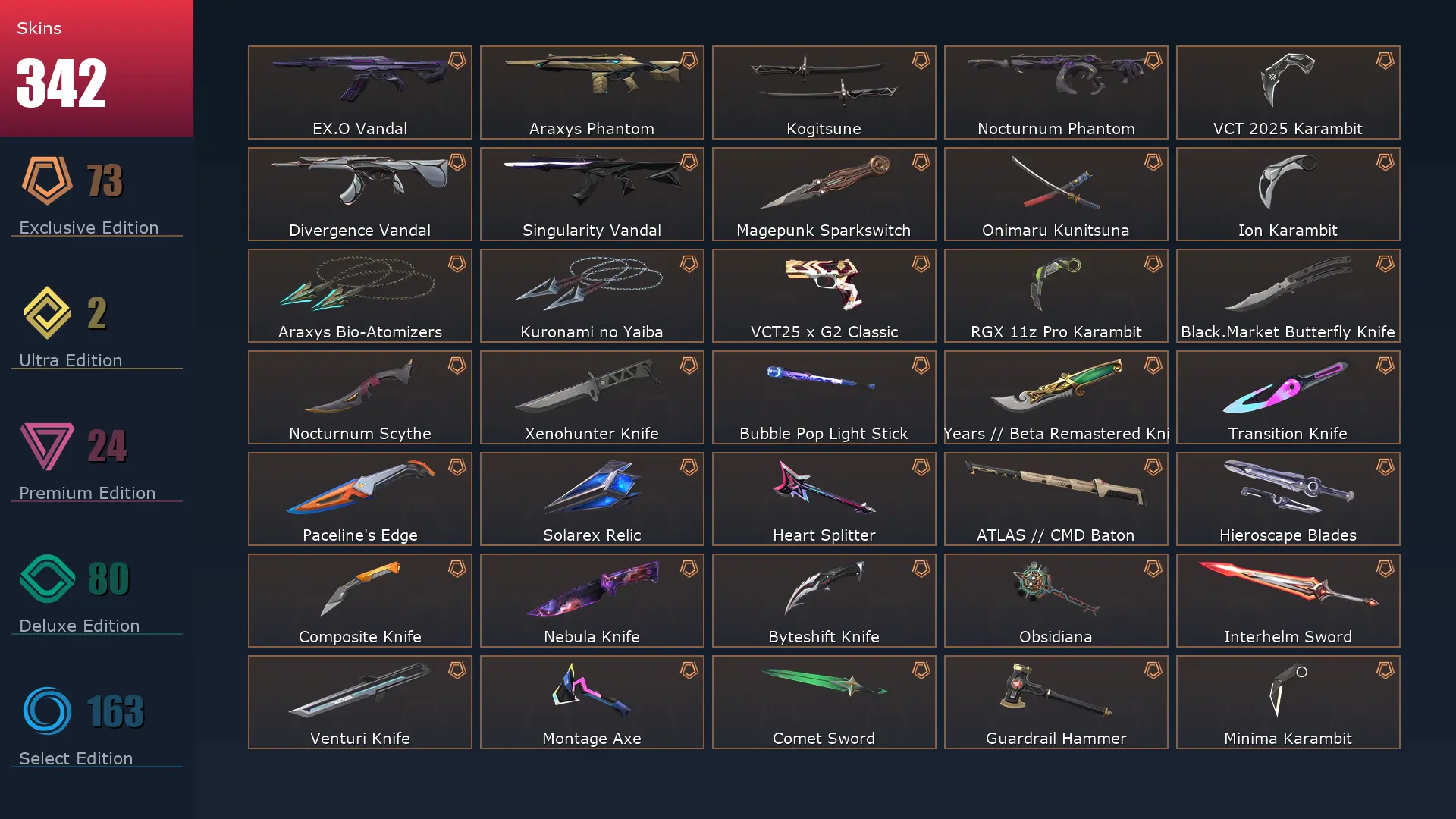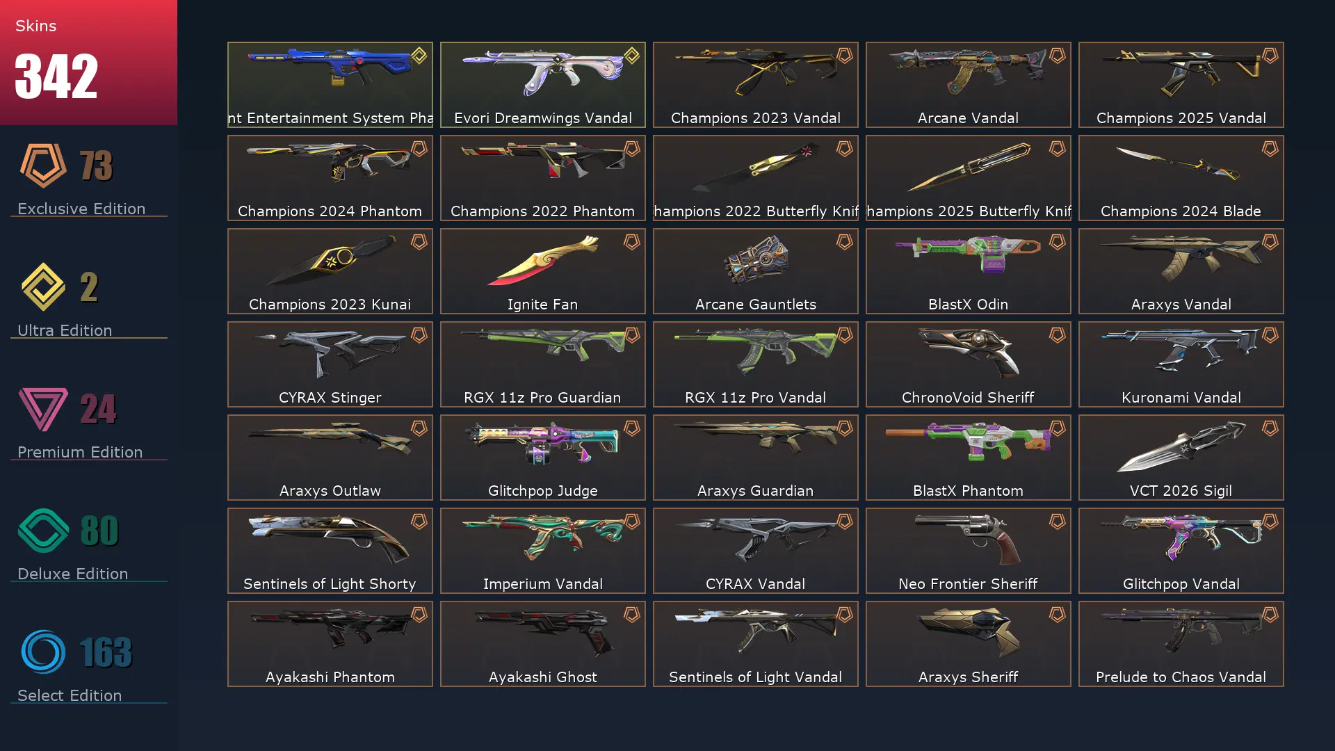 EU 🖱 342 Skins 🥳 Immortal 1 🧴 29 Agents 🧘♂️ Champions 2023 Vandal 🫢 Arcane Vandal 🐵 Champions 2025 Vandal 💫 Champions 2024 Phantom 😚 Champions 2022 Phantom 🚃 Champions 2022 Butterfly Knife 🥸 Champions 2025 Butterfly Knife