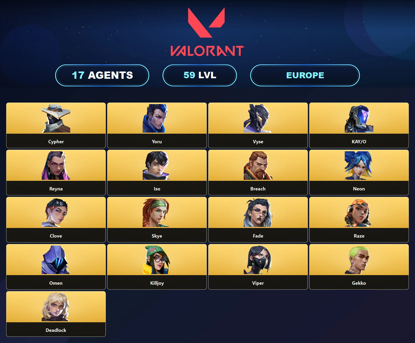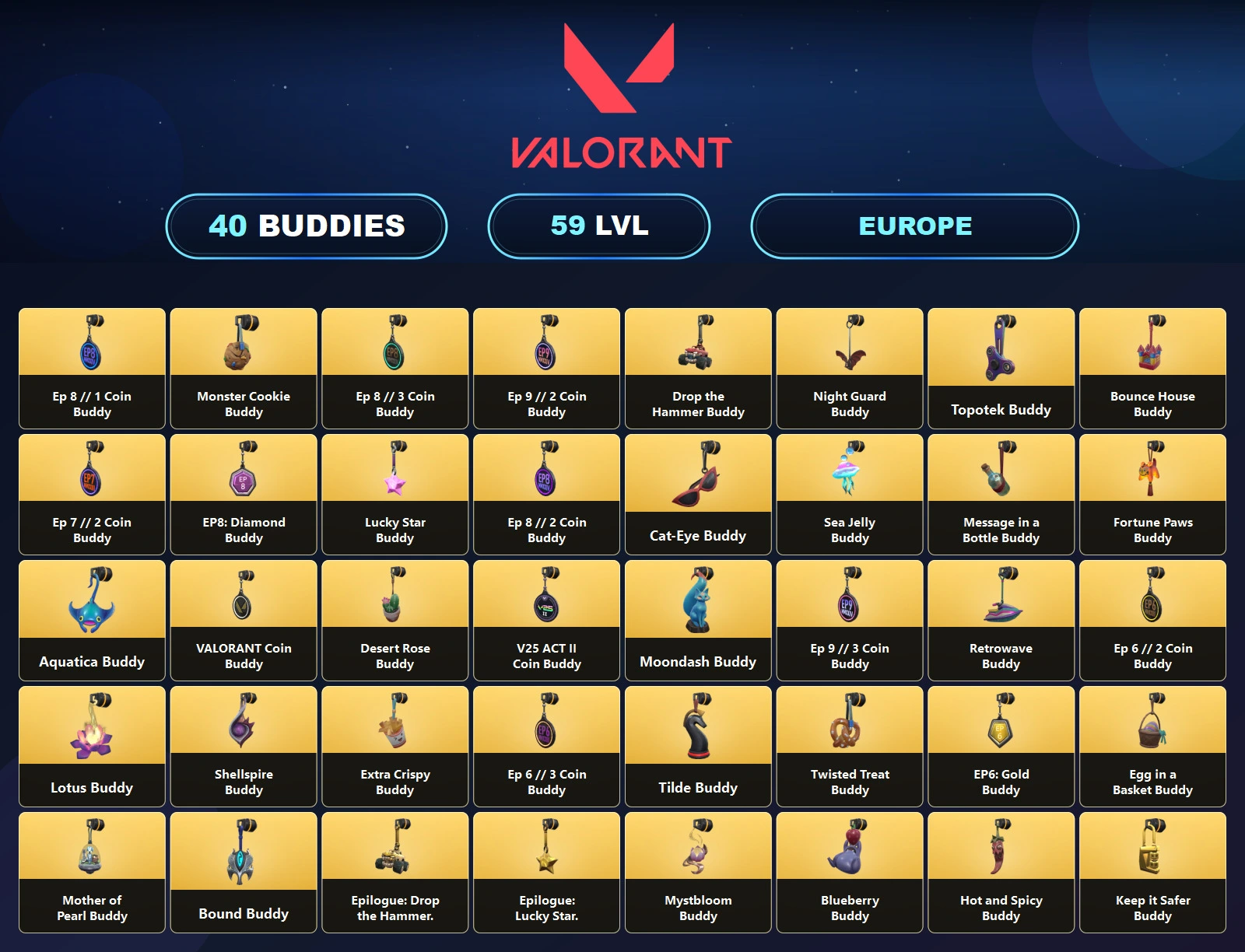 EU 🔥 54 Skins 🏁 59 Level 🎪 Elderflame Vandal 🪙 RGX 11z Pro Vandal 🪐 Spectrum Phantom 💠 Reaver Karambit 🐔 Singularity Sheriff 🎲 Araxys Vandal 🌙 Mystbloom Phantom 🛳 Unranked 🍋 17 Agents
