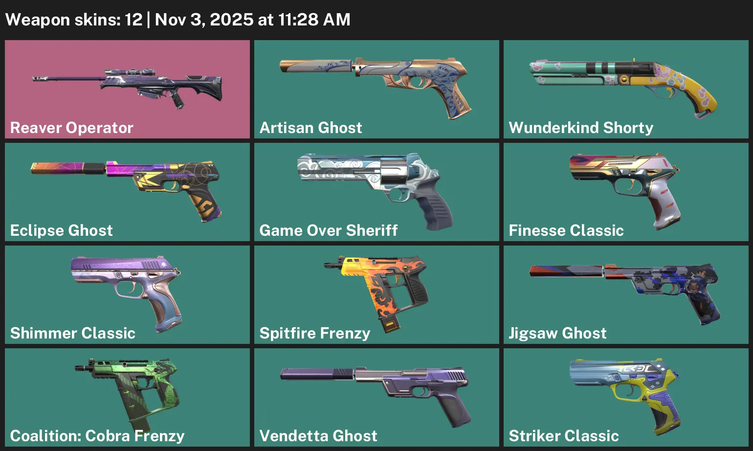 💽 EU 🌈 Unranked 🥹 12 Skins 🛶 46 VP 🎞 18 Agents 🐦⬛ Value: 1775 VP 🐴 Reaver Operator 🍰 Artisan Ghost 🚜 Wunderkind Shorty 🍈 Eclipse Ghost 🧪 Game Over Sheriff 🍱 Finesse Classic
