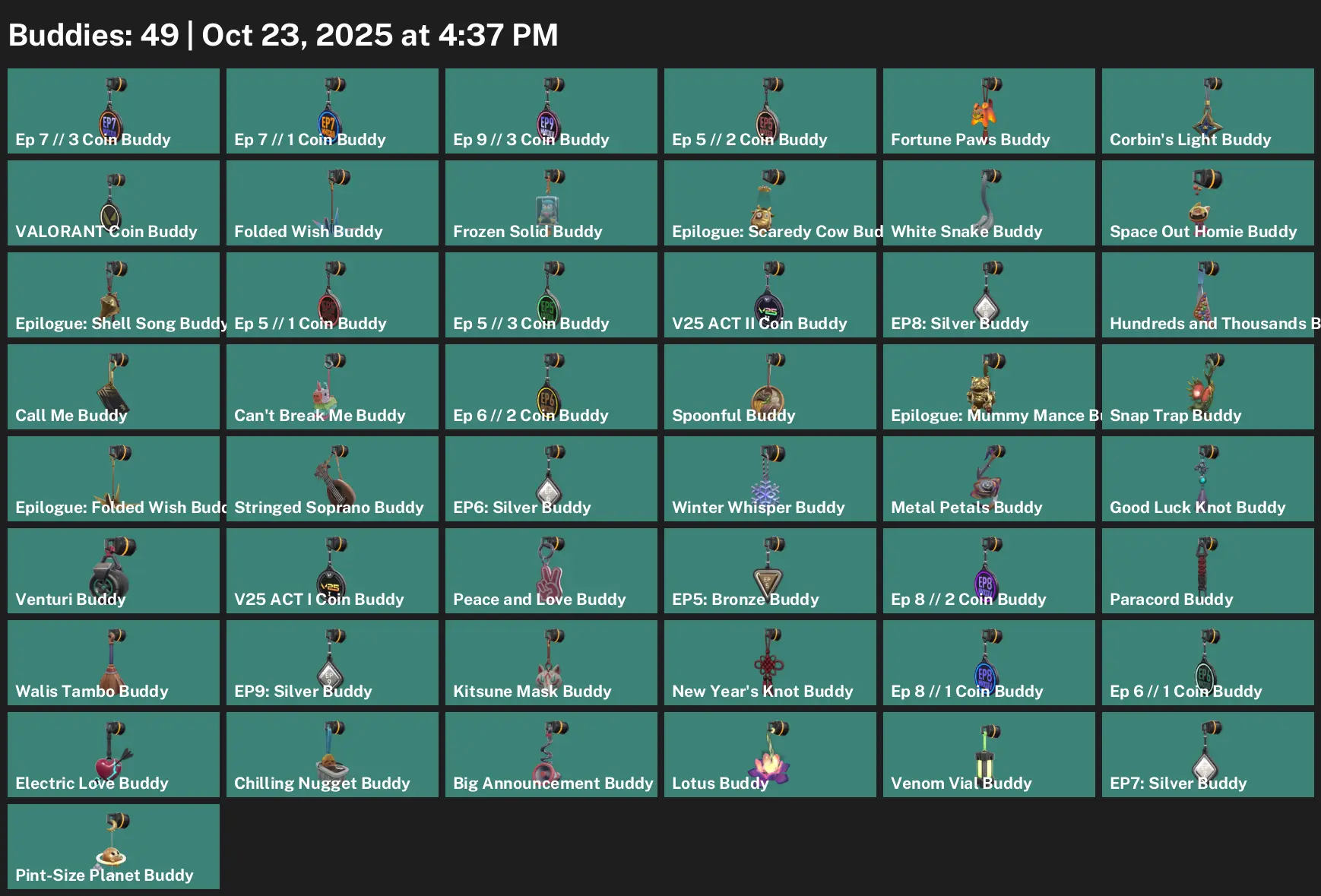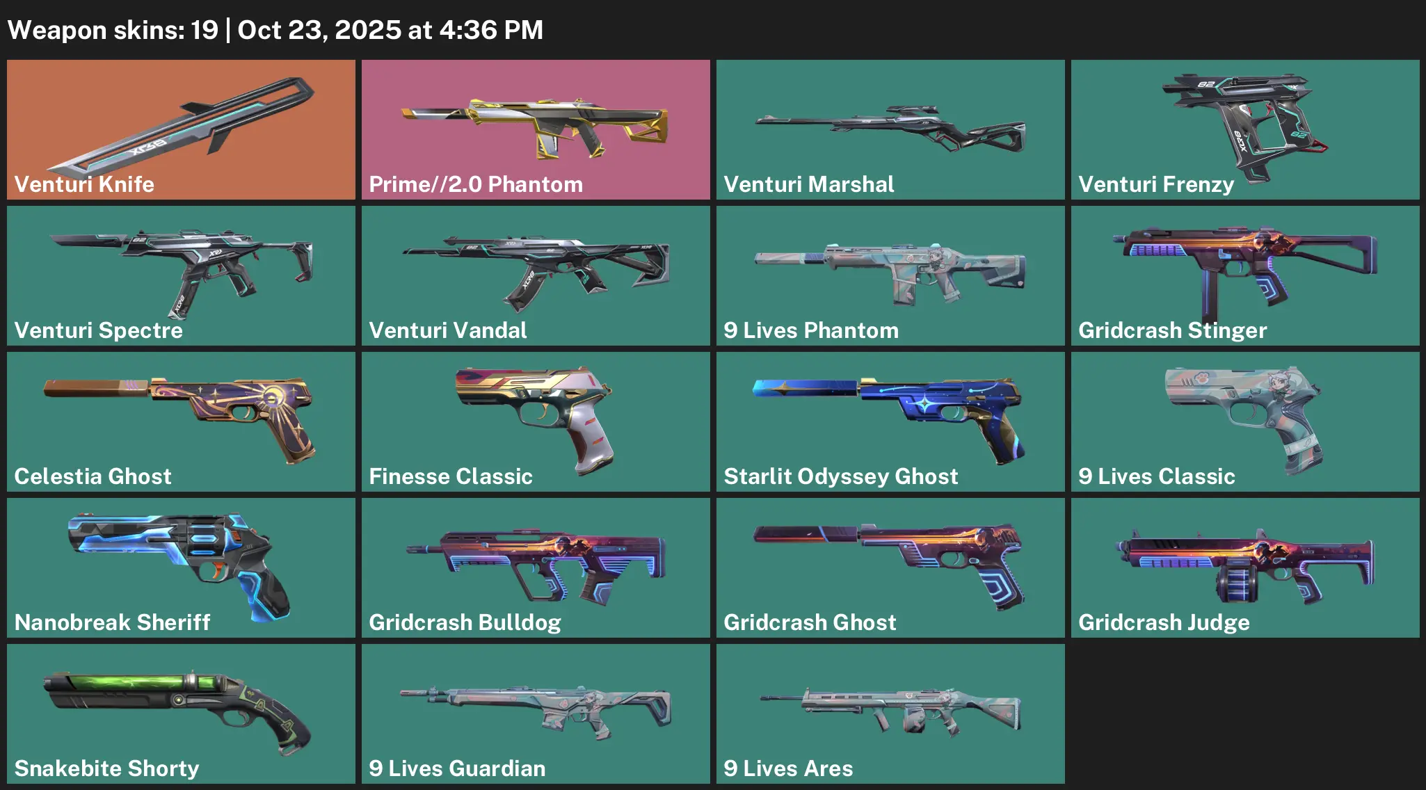 ☁️ LA 🥬 Unranked 🦩 19 Skins 💻 450 VP 🎳 21 Agents 🍎 Value: 1775 VP 🐫 Venturi Knife 🎨 Prime//2.0 Phantom 🐩 Venturi Marshal 🛥 Venturi Frenzy 🐃 Venturi Spectre 🦃 Venturi Vandal