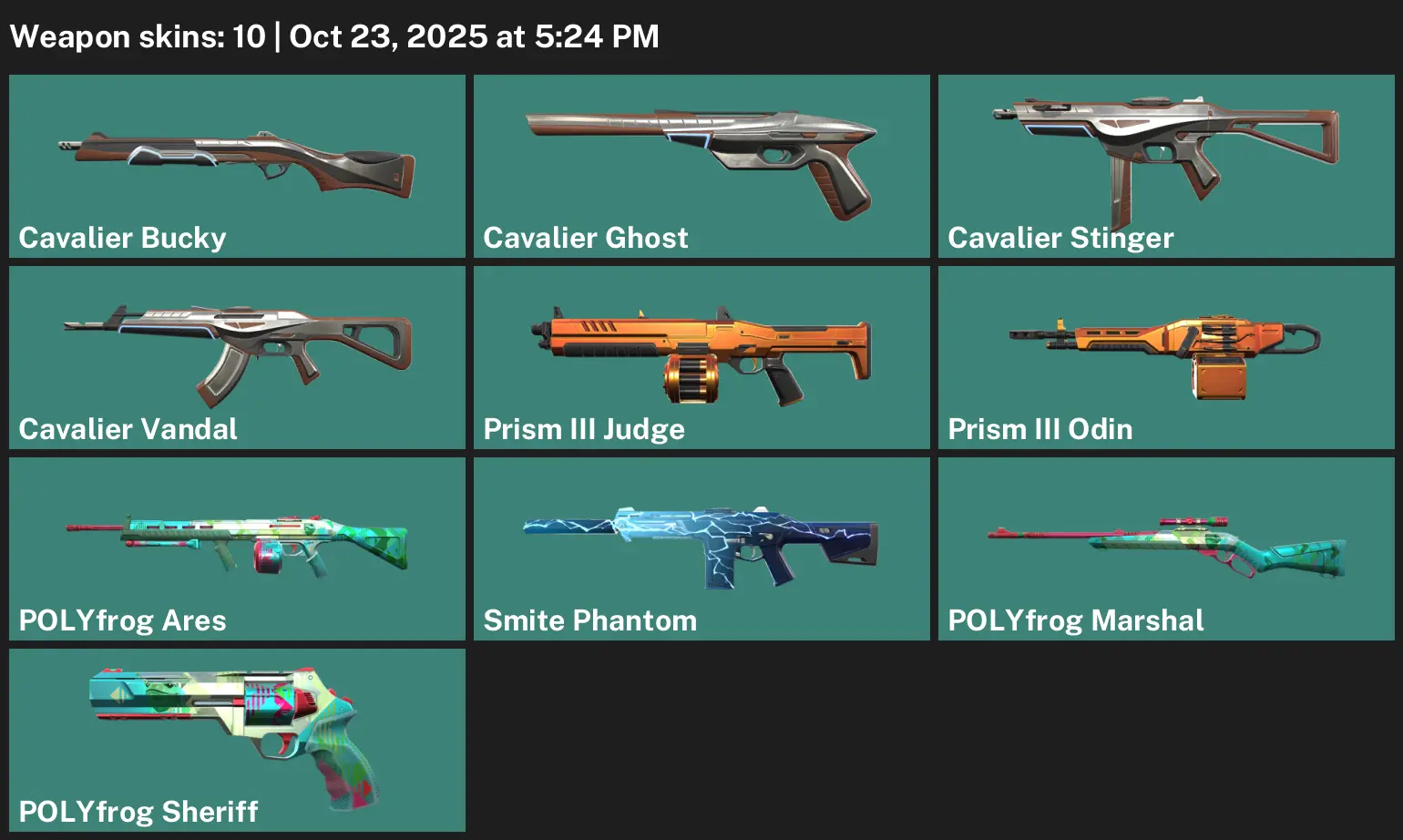 🌤 NA 📱 Unranked ⚙️ 10 Skins 👀 125 VP 🦅 2 Agents 🐇 Value: 875 VP 🤫 Cavalier Bucky 🫥 Cavalier Ghost 🌓 Cavalier Stinger 🫀 Cavalier Vandal 🏢 Prism III Judge ⛑ Prism III Odin