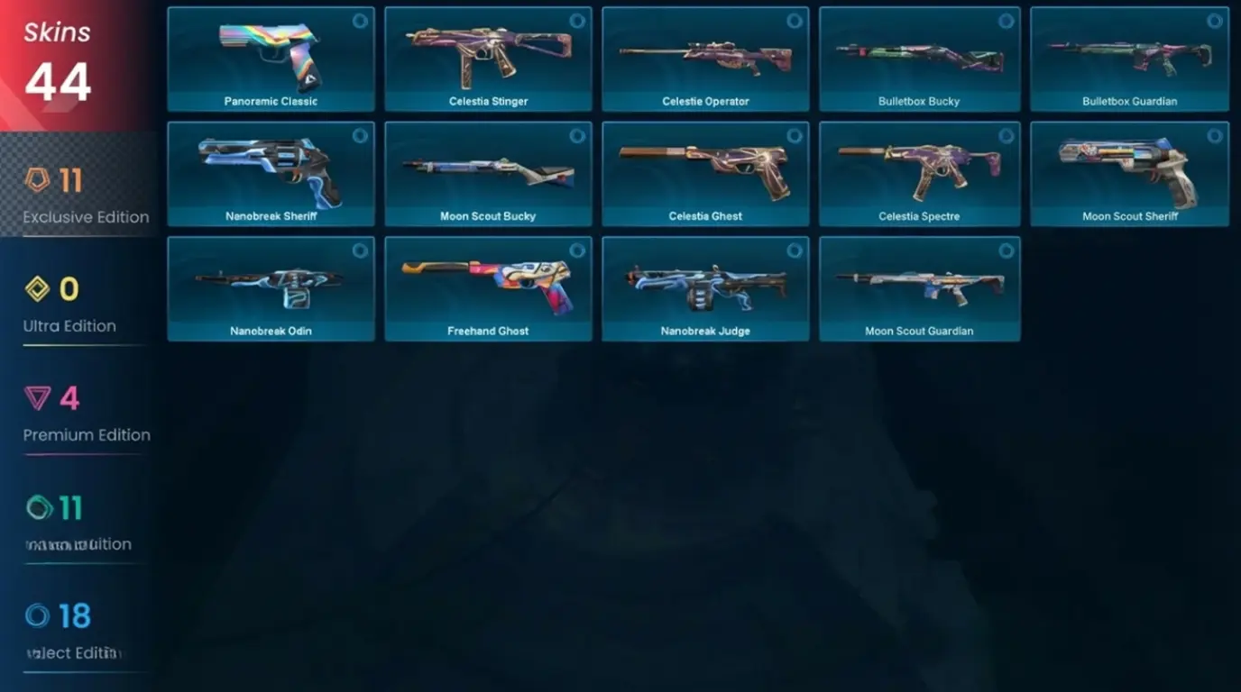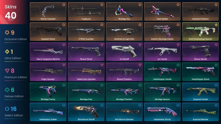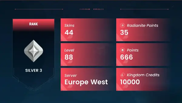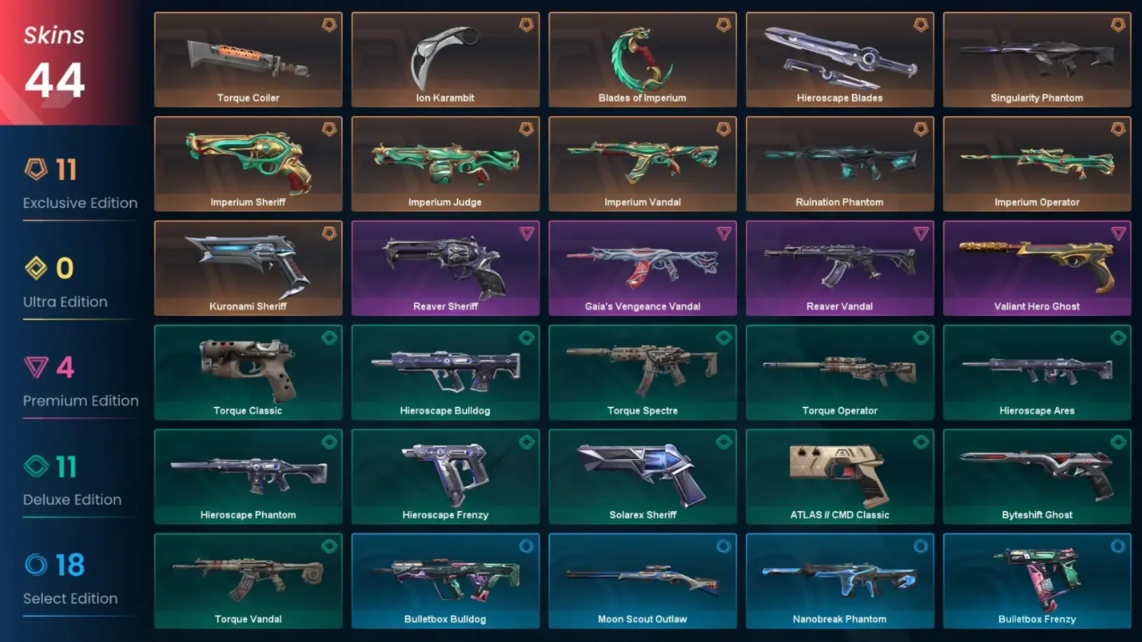 Valorant account with 44 skins. Includes Ion Karambit, Imperium collection, Ruination Phantom, and more. Full access with changeable email