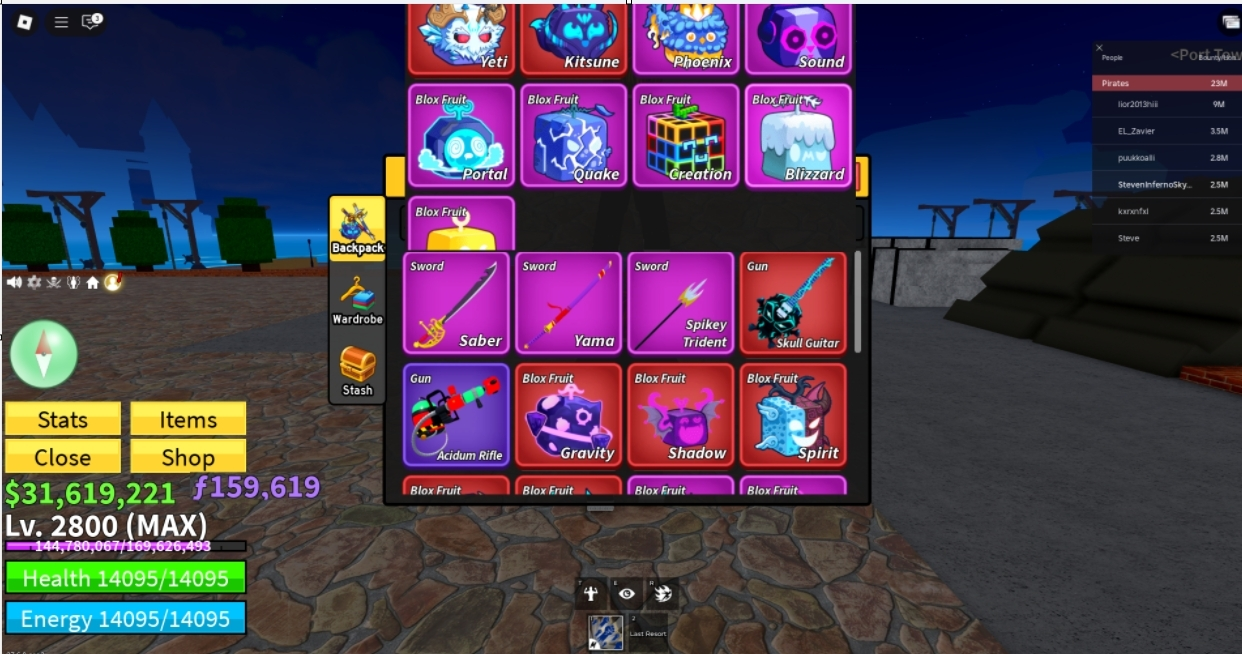 Blox Fruits / ☄️ 2800 LV / 🏆 Kitsune / 🎯 Gravity / 🔥 Shadow / 🌺 Spirit / 🏆 Yeti / 🔥 Buddha / 🏆 Portal Inventory / God Human / 🎯 Skull Guitar / 🎮 31M BELI / 🔥 159K FRAGMENTS / ✨ INSTANT DELIVERY