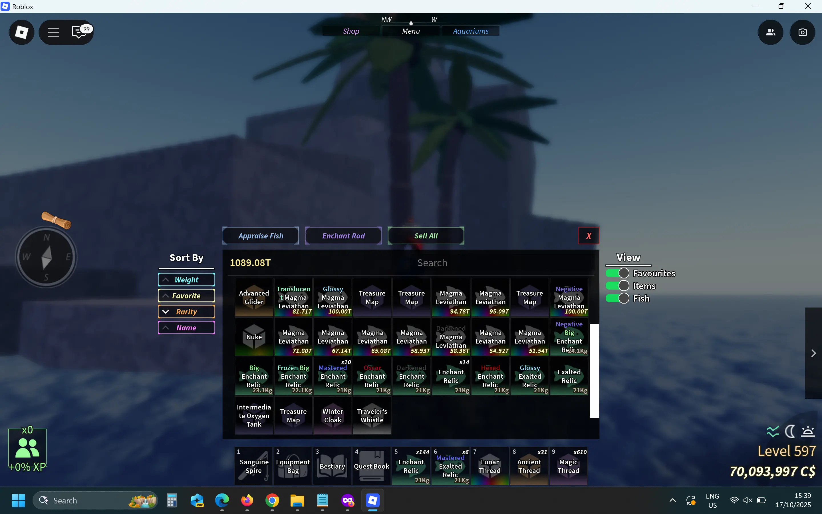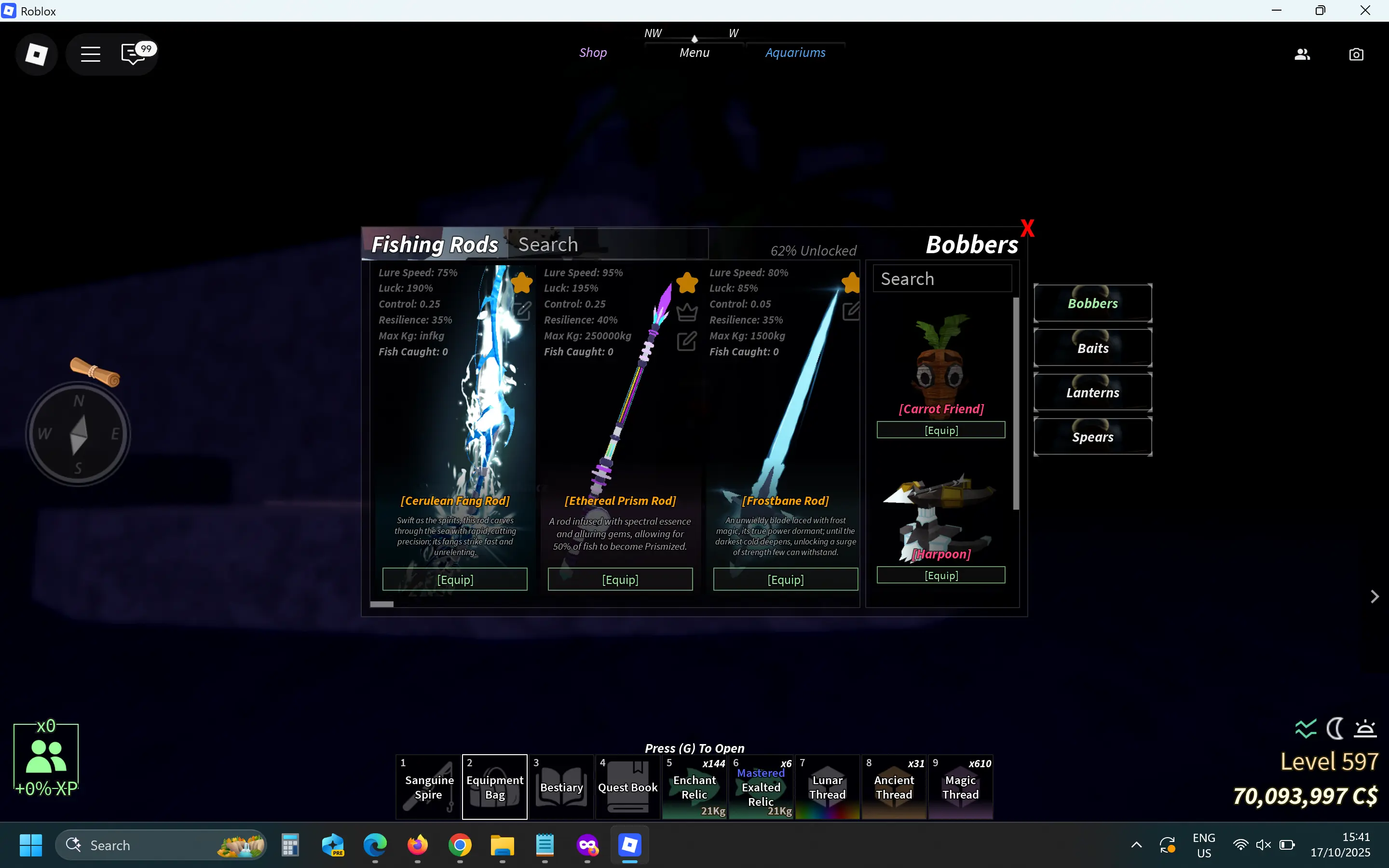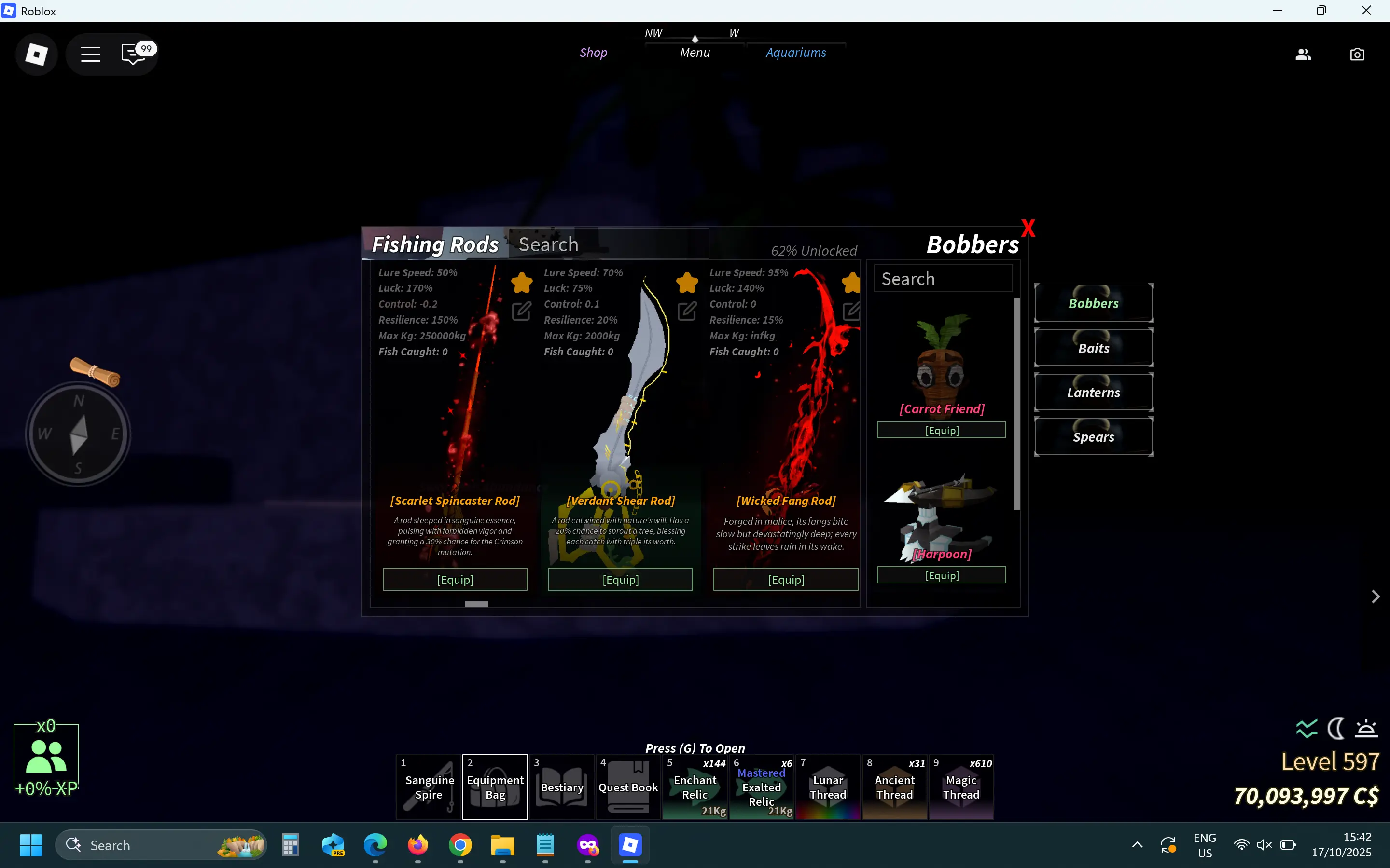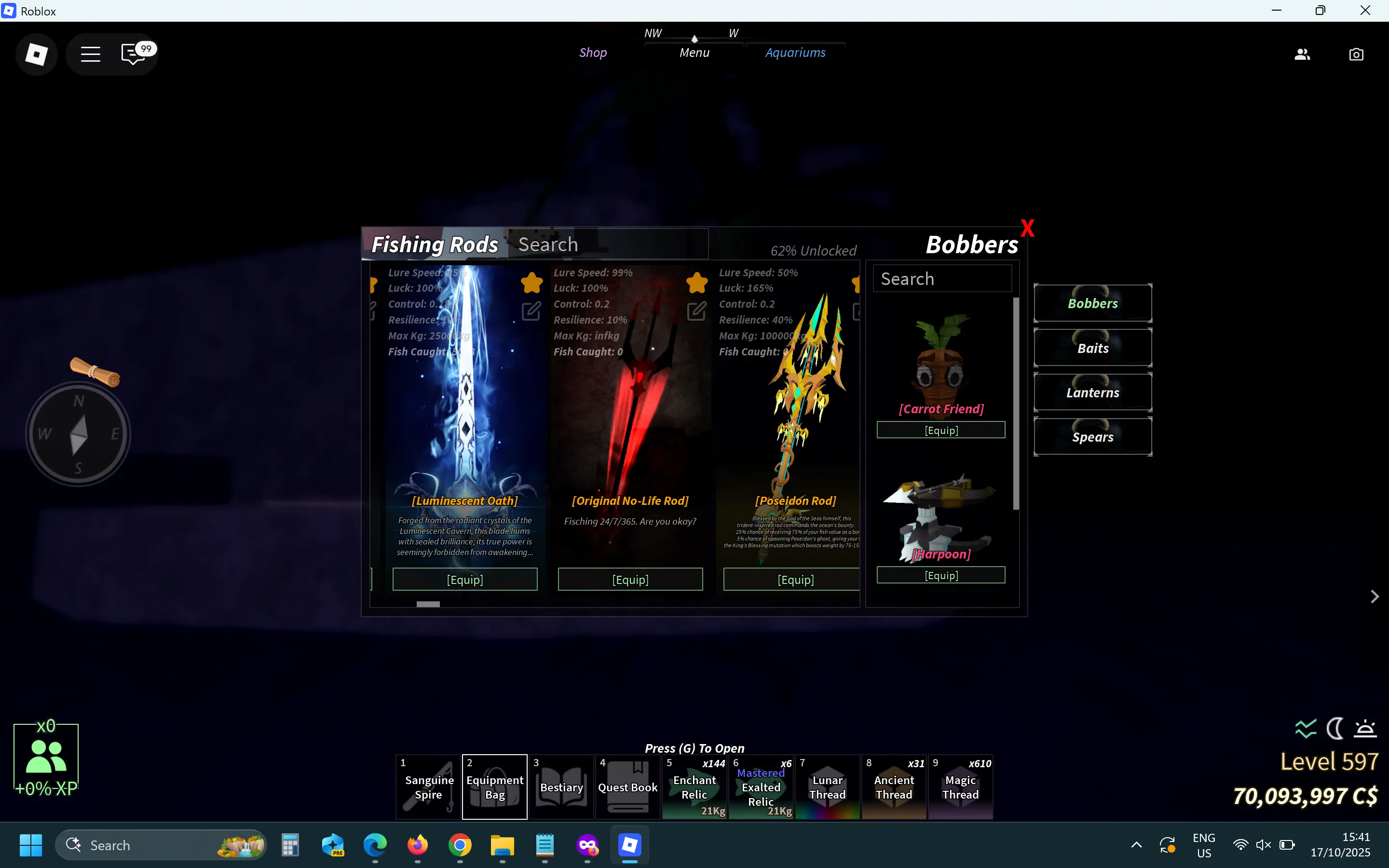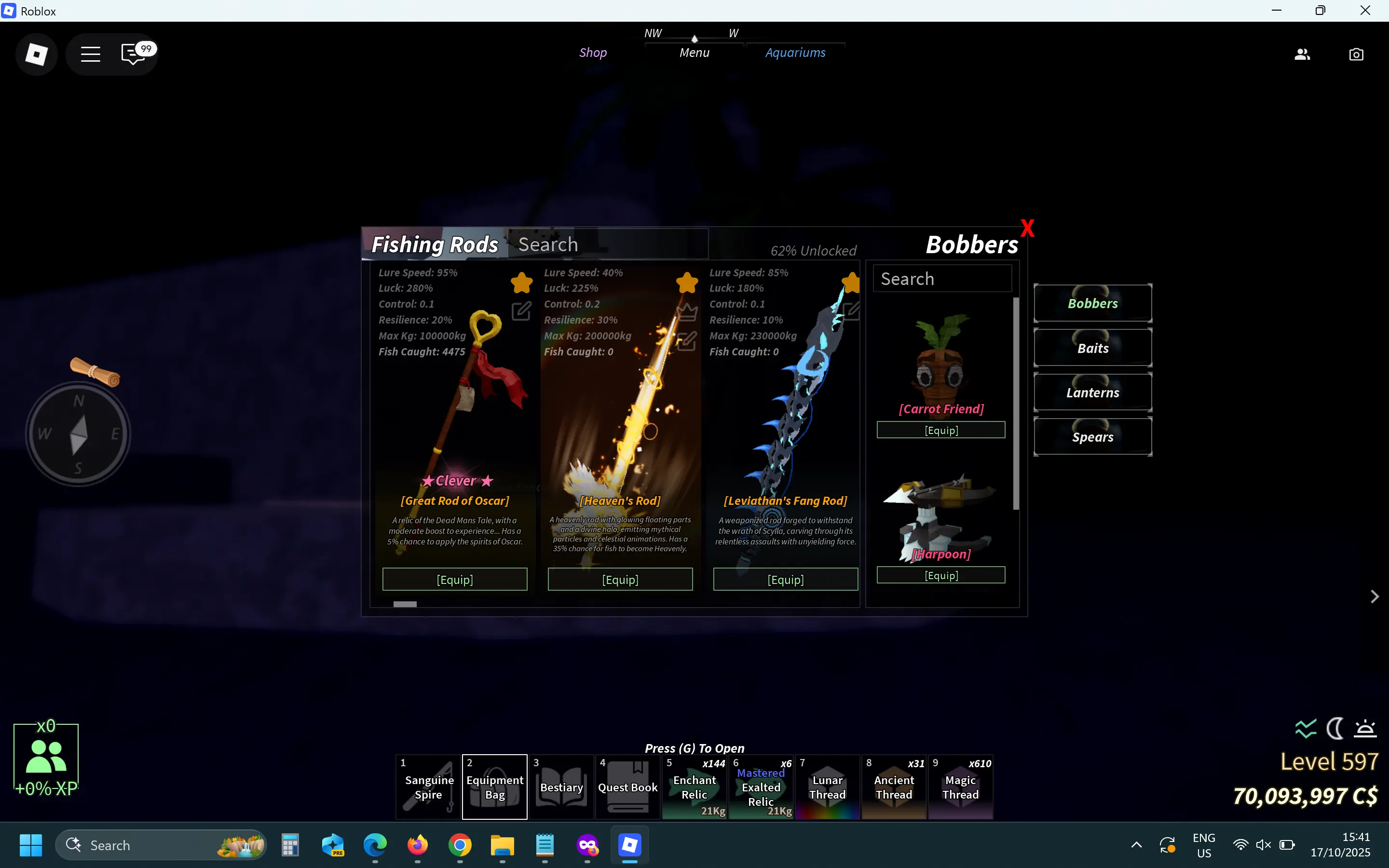 [Instant] [Fisch] 70M C$ | Rods (62%): Luminescent Oath, Cerulean Fang, Ethereal Prism, Frostbane, Great Rod of Oscar, Heaven, Leviathan, Original No-Life, Zenith, Sanguine Spire, Wicked Fang, Scarlet Spincaster | Exalted/Enchant Relic | Level 597