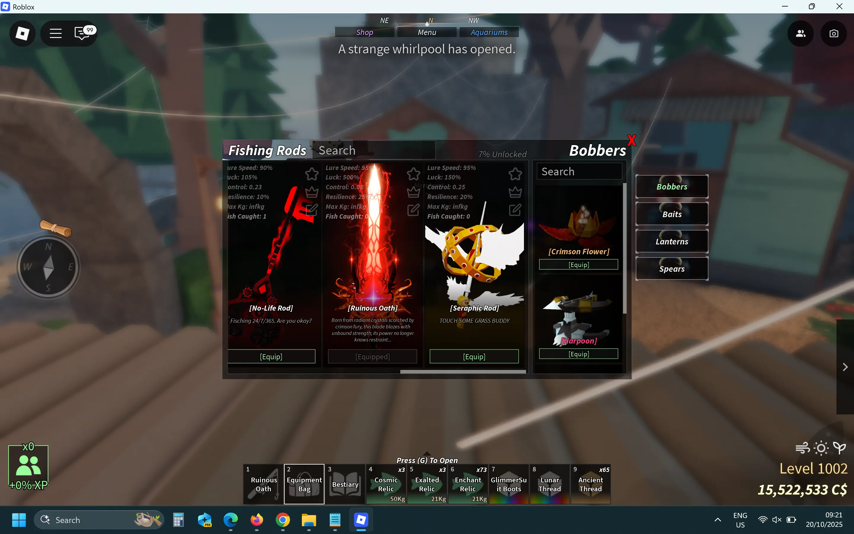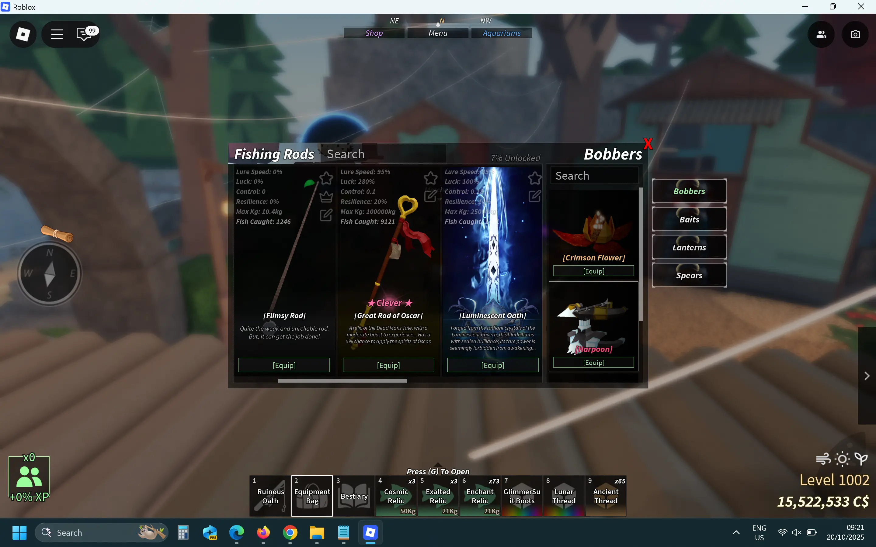 [Instant] [Fisch] Level 1002 | Rods: Ruinous Oath, Luminescent Oath, Clever Great Rod of Oscar, Seraphic, No-Life, Carrot | NUKE, Cosmic Relic, Exalted Relic, Enchant Relic, Lunar Thread, Ancient Thread | 15M C$