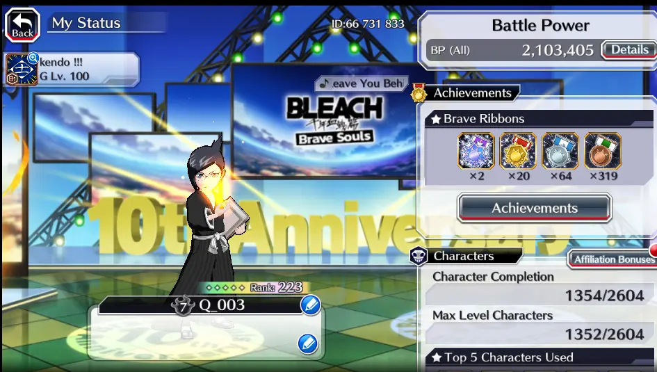 BBS09-4:Rank 223 ⸱ Guild LeveL 100 ⸱ Battle Power 2,103,405 ⸱ Character Completion 1354/2604