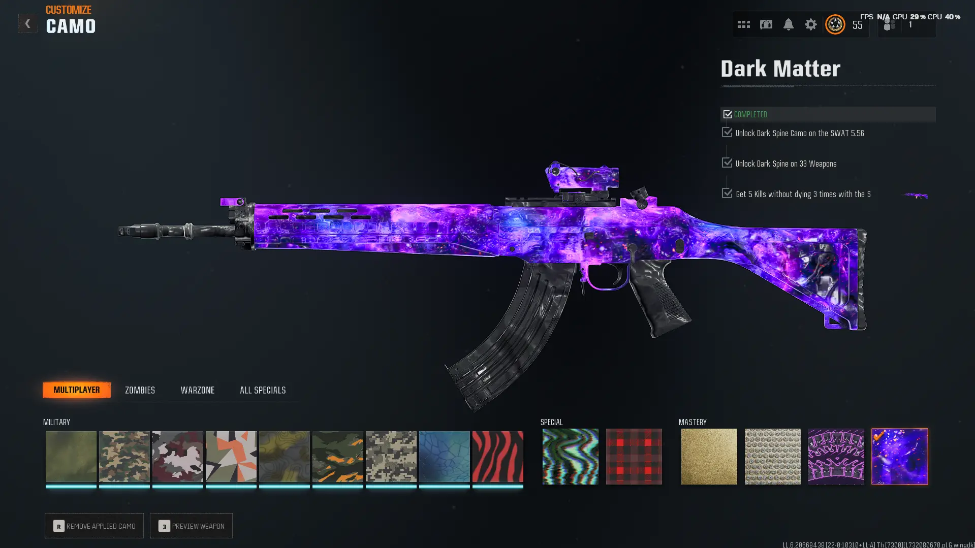 【🍂 BO6 🍂】【 Dark Matter Legit Unlocked + Level 55 】 ⚔ All Multiplayer Camos Unlocked ✨ Prestige 1 Ready ⚡ Dark Matter Legit Unlocked on all 33 Black Ops 6 Guns ☄ Linkable to STEAM / BNET / XBOX / PSN #ZB30JQ