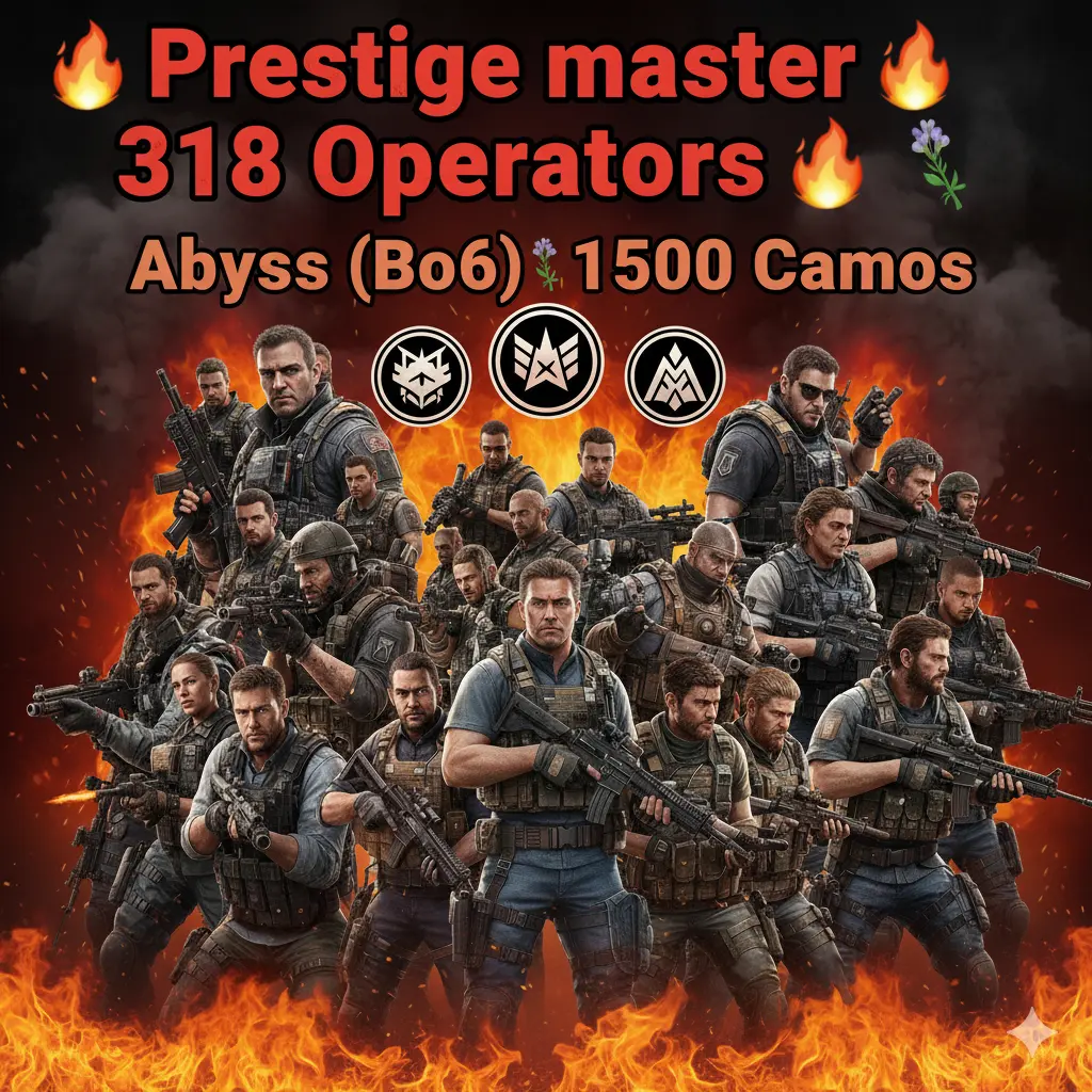Prestige master 315 LvL 🔥318 Operators 🔥 Abyss (Bo6) ⸱ Interstellar (Mw3) ⸱ Orion (Mw2) ⸱ Damascus (Mw1) 🪻 1500 Camos ✔️ 160 Guns maxed 🎶 See description ✨ Full access 🎉 Instant delivery ✔️Linkable to all platform #affn1