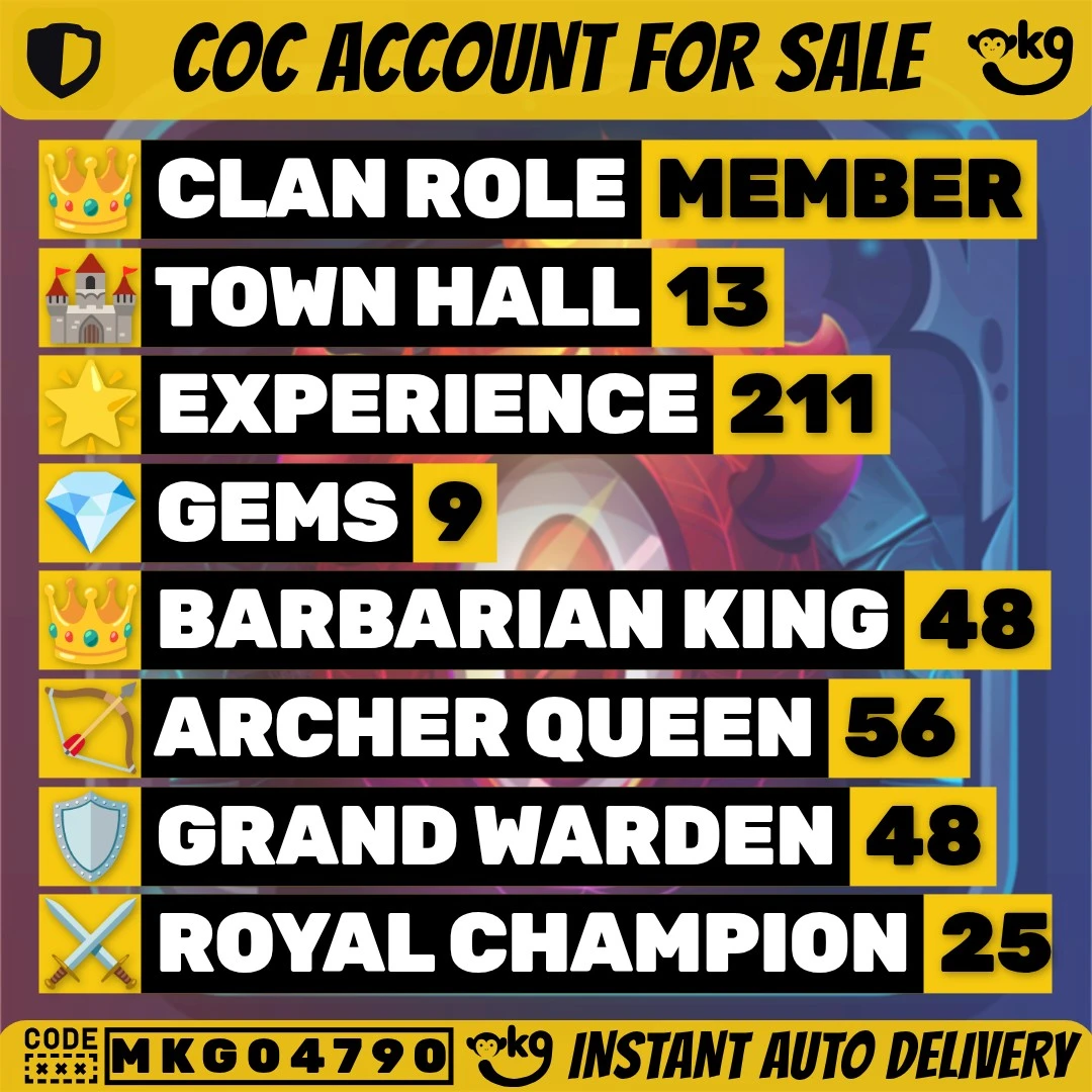 ✨ Clash of Clans 🏆 TH13 ✨ Level 211 ✨ BK48 AQ56 MP40 GW48 RC25 ✨ 9 Gems 🔰 Complete Access ✨ Instant Delivery !MKG04790