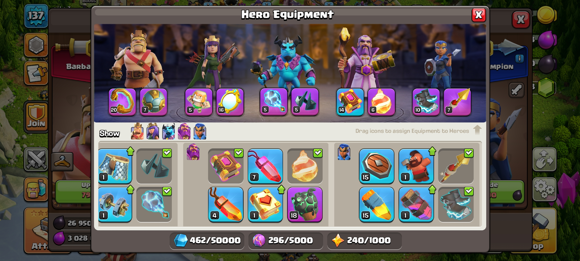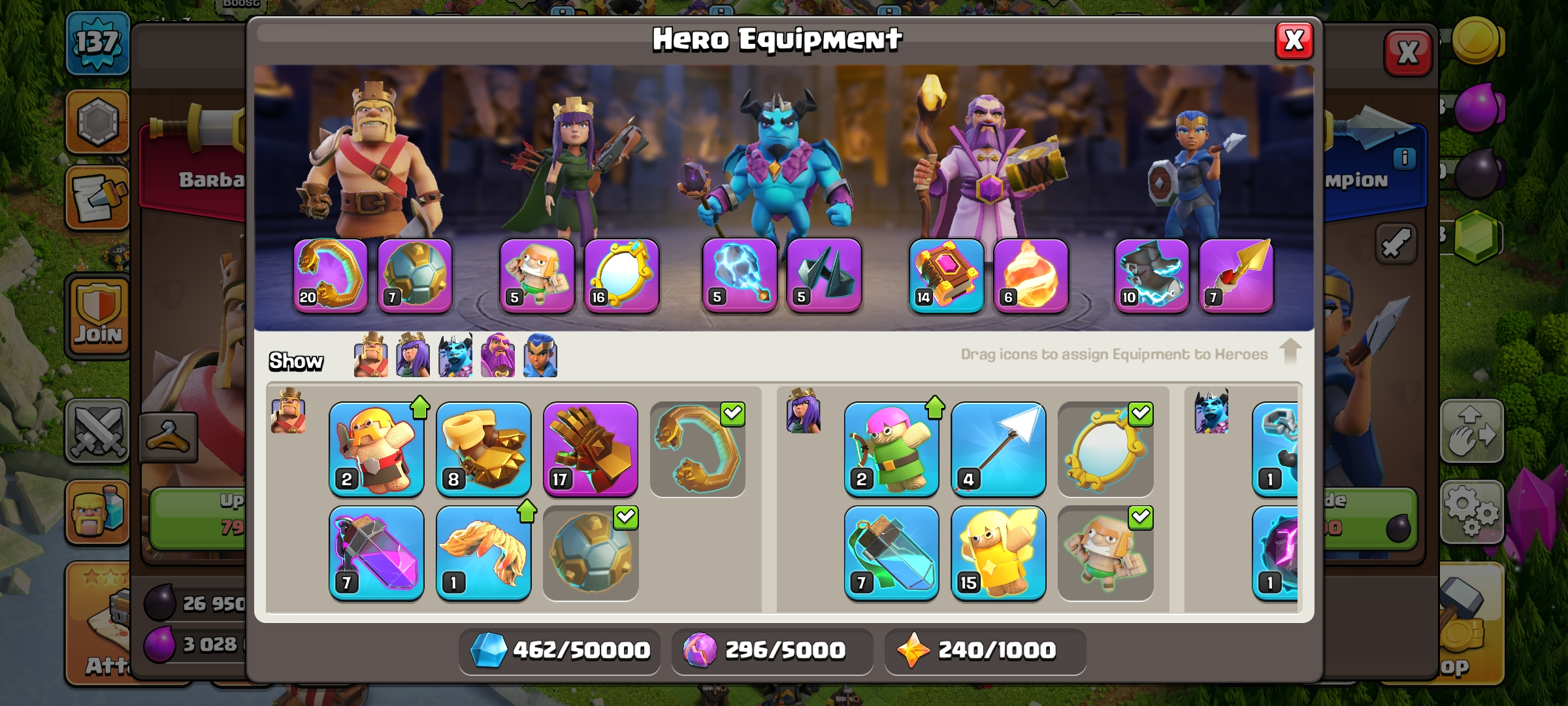 TH 17 RARE~HERO EQUIPMENT EPIC FULL~HERO BIG AND TALL- XP 137 /BK 47 -/AQ 76 /PM 40 /GW 21/RJ 21-/LOG SUPERCELL ID-/Andoid and ios|SCREENSHOTS ON DESCRIPTION