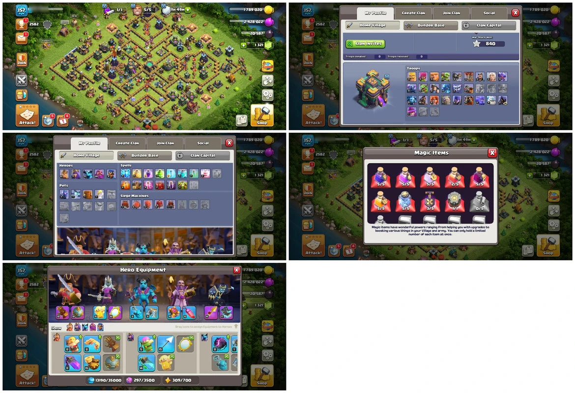 TH14 Semi Max ⛏️ Level 157 🌟 Heroes 62_71_33_40_9 🎯 Gems 1321 🧟♂️ 5 Worker 🏠 5 Skins 🪖 5 Epic equipment (Android & iOS) 🧱 M3587
