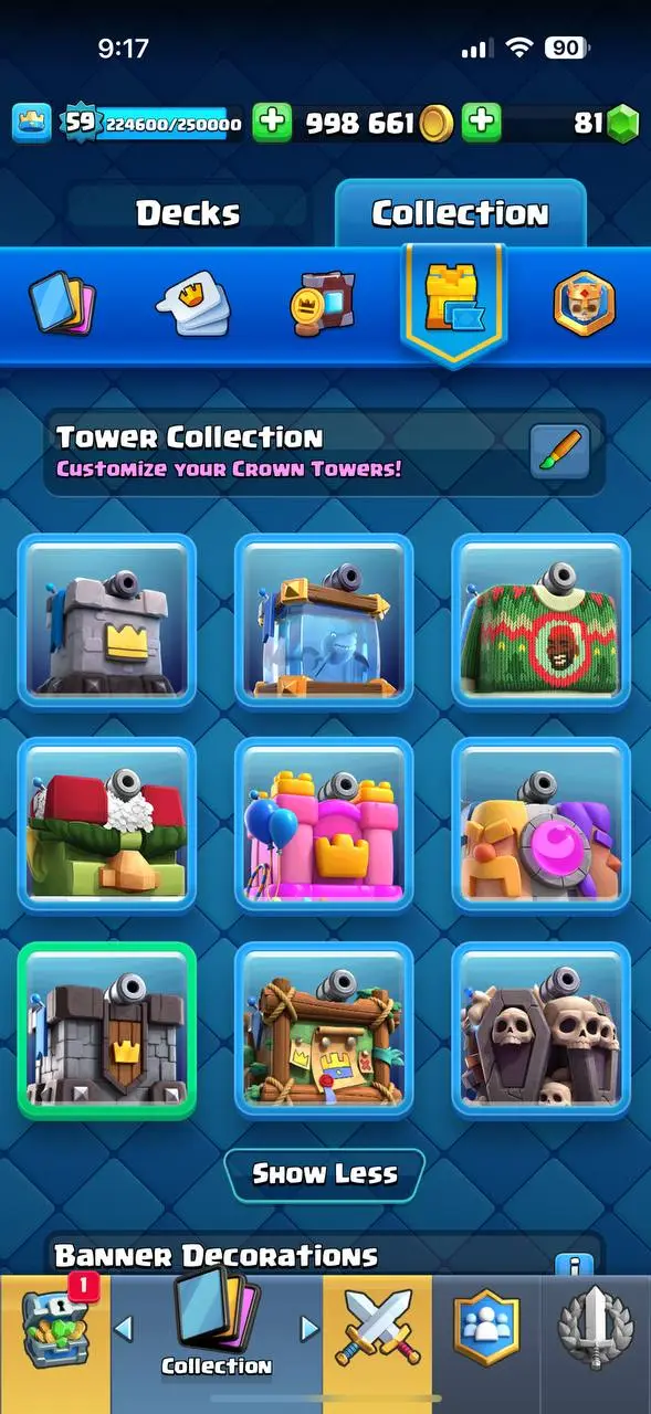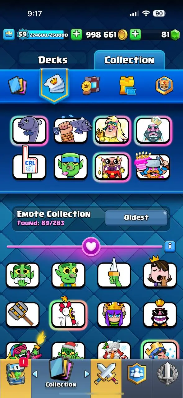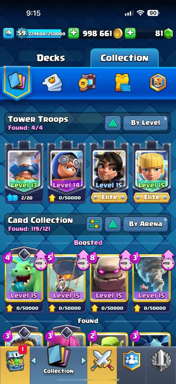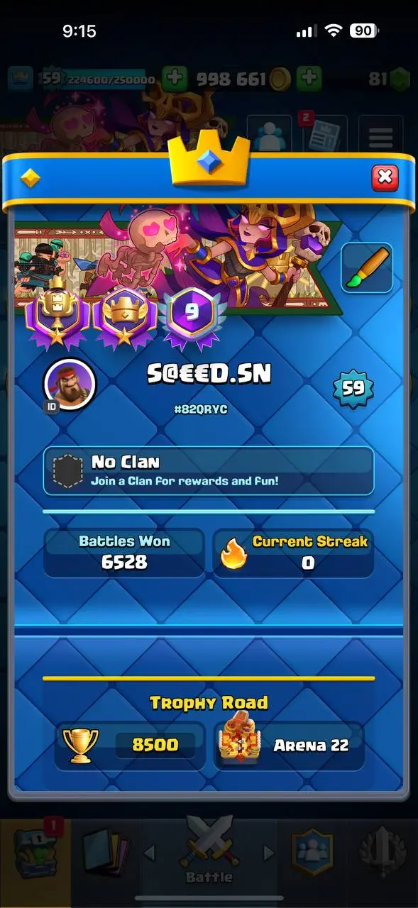 0p 6 DIGIT TAG💥 9 YEAR BADGE 🔹 85 MAX CARDS ⚔️ ARENA 22 🔹 19 ELITES 🔹 6 EVOS 🏆 8500 TROPHIES 📈 XP59 🏰 KT15 💎 81 GEMS 😀 89 EMOTES ⚡️ INSTANT