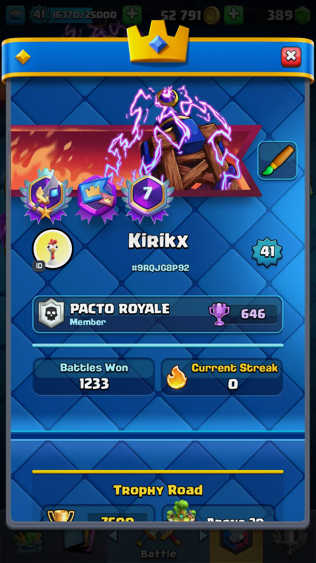 7500 TROPHY 🏆 13 KT 🚀 LVL 41 👑 117 CARDS 🍉 2 MAX CARDS 👑 1 ELITE CARDS ⚡ 28 EMOTE 🚀 EVO 8 🎭 #9RQJG8P92 ⸱ TAG ACCOUNT ♥️