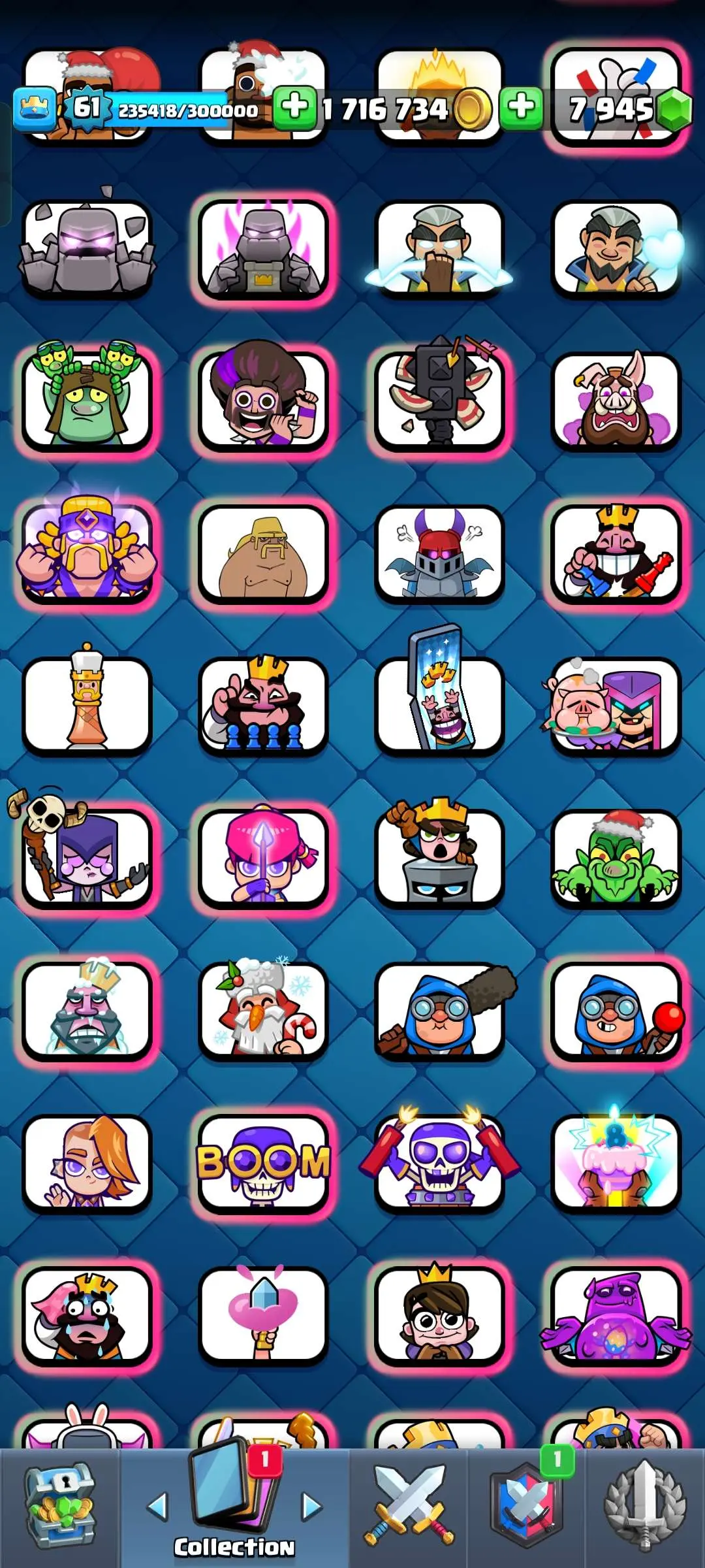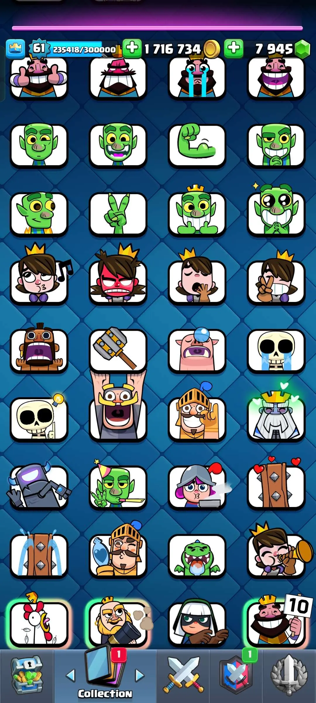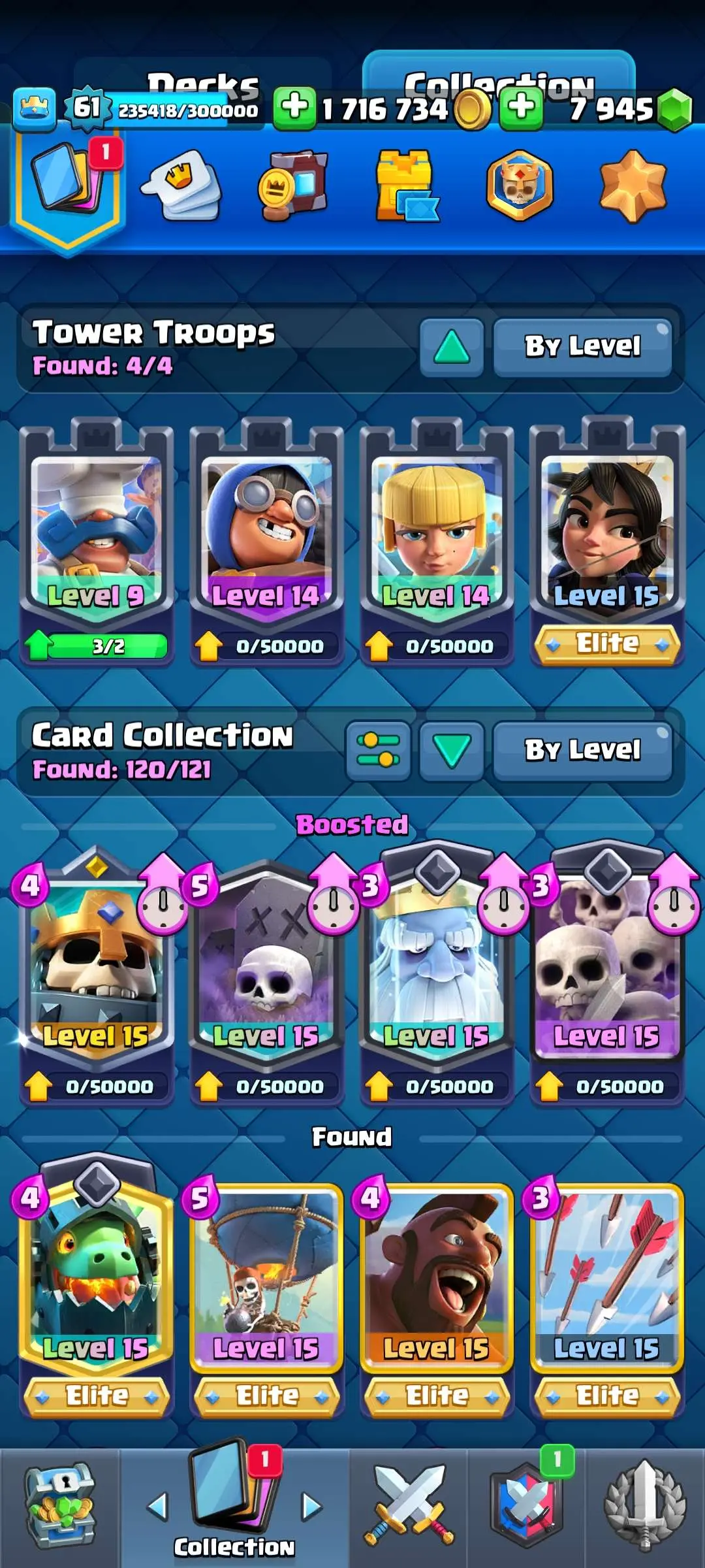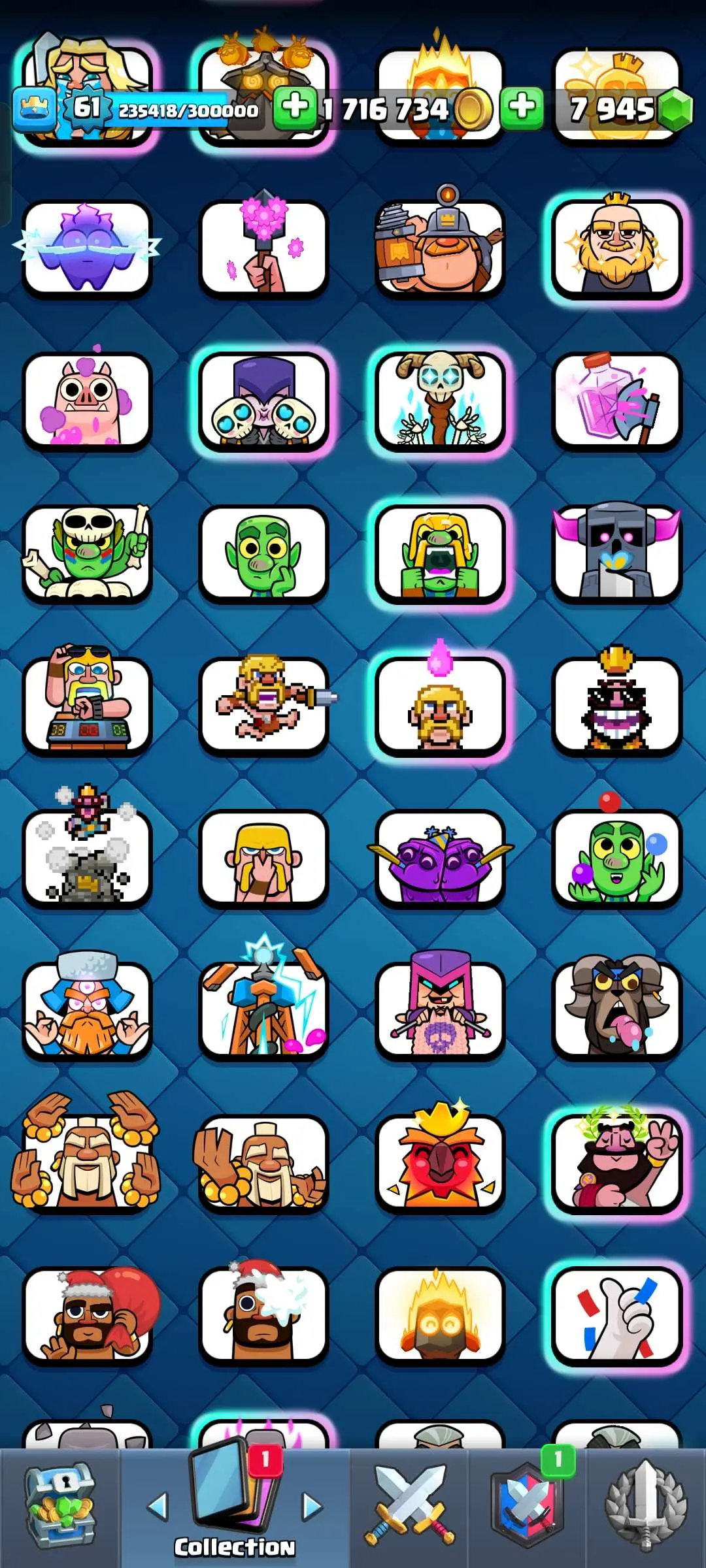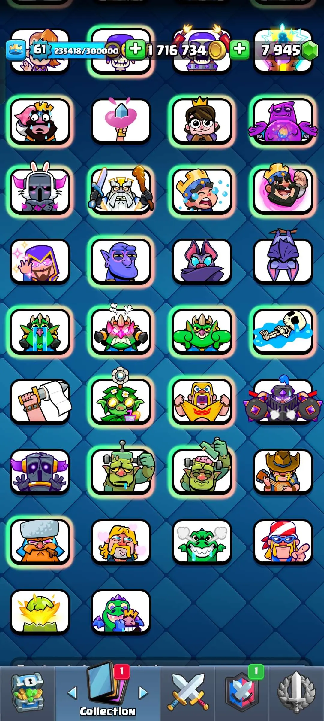 CR Lvl 61 almost 62 ✨ 9000 Trophy ✨ KT 15 ✨ 29 elite cards ✨ 114 max cards ✨ 14 Evo cards ✨ Rare emotes ✨ 1.7M coins ✨7.9 K Gems ✨ 180 emotes ✨ 24 Tower skins