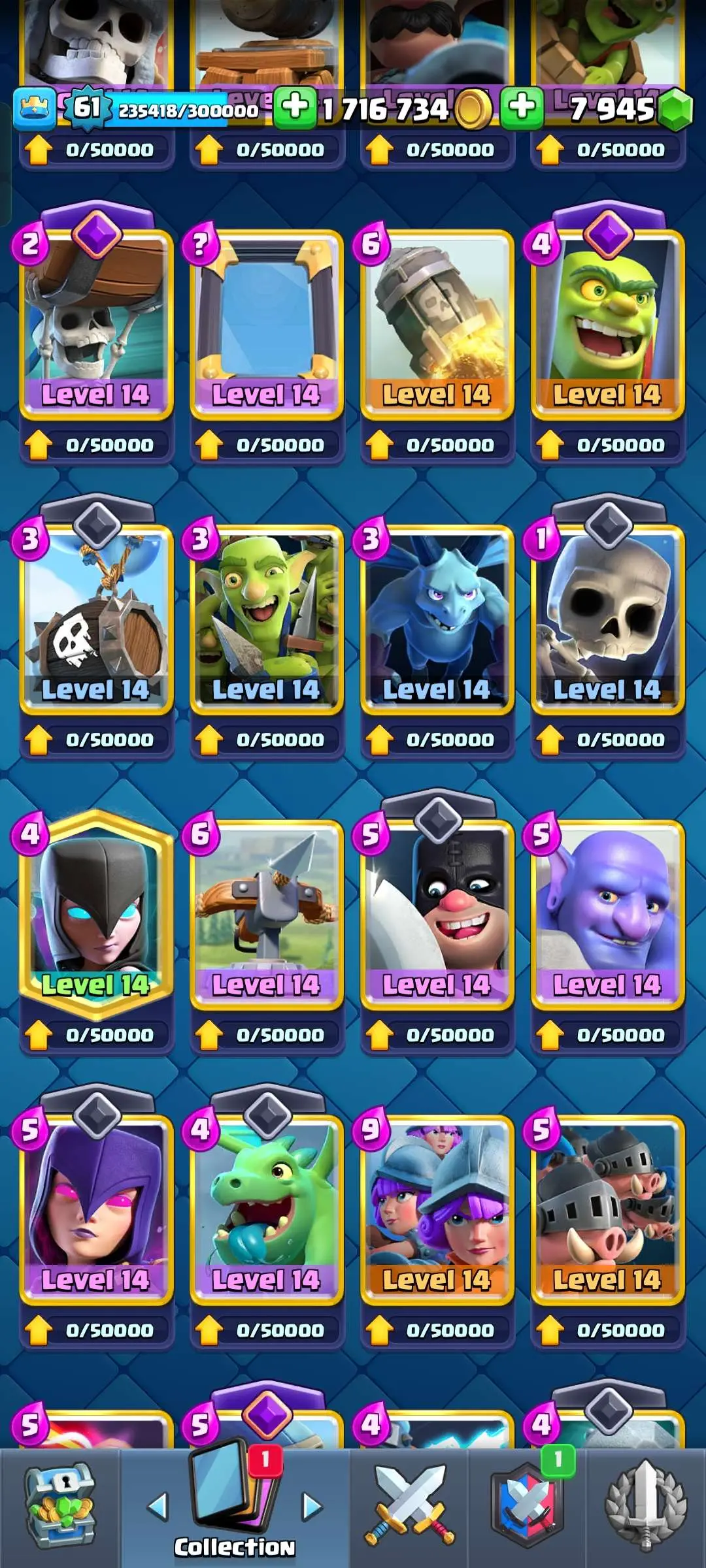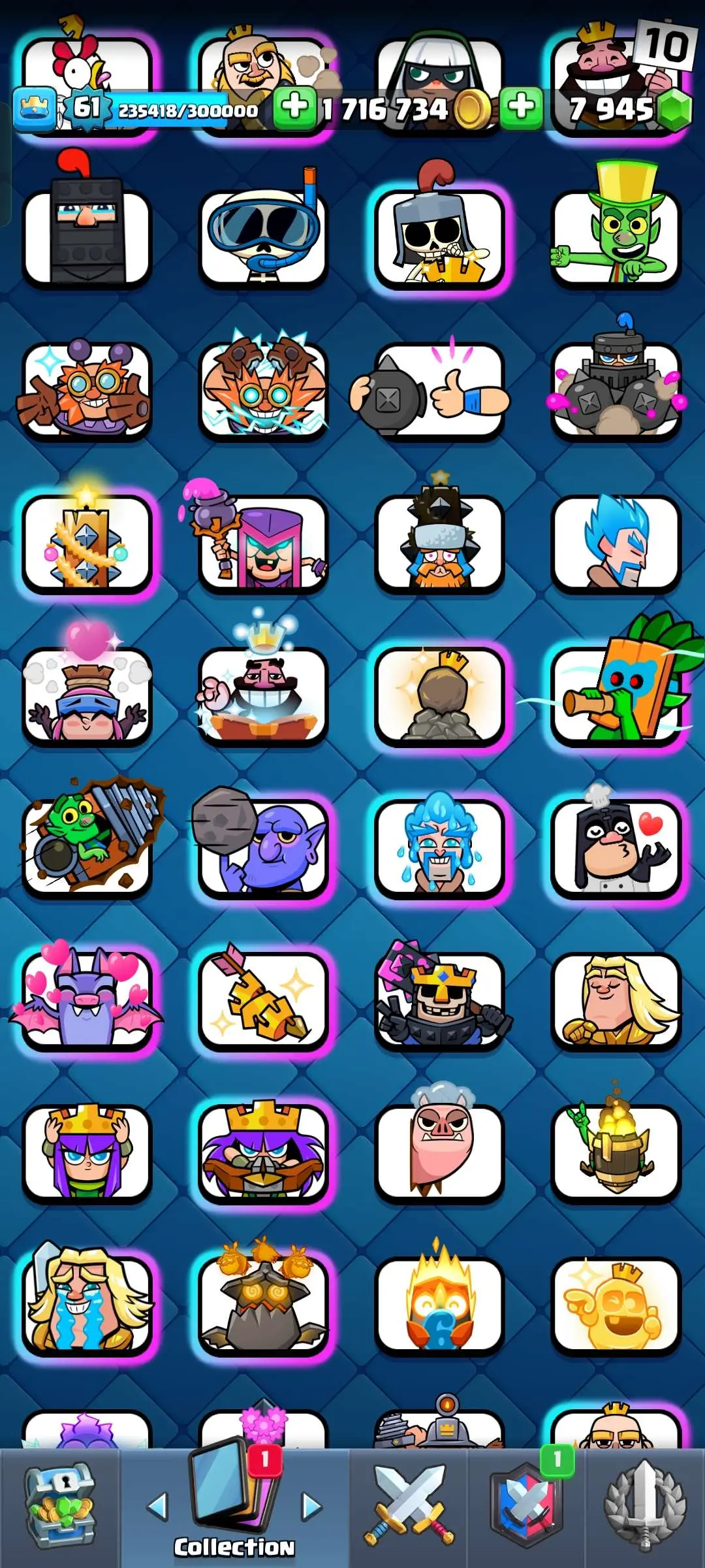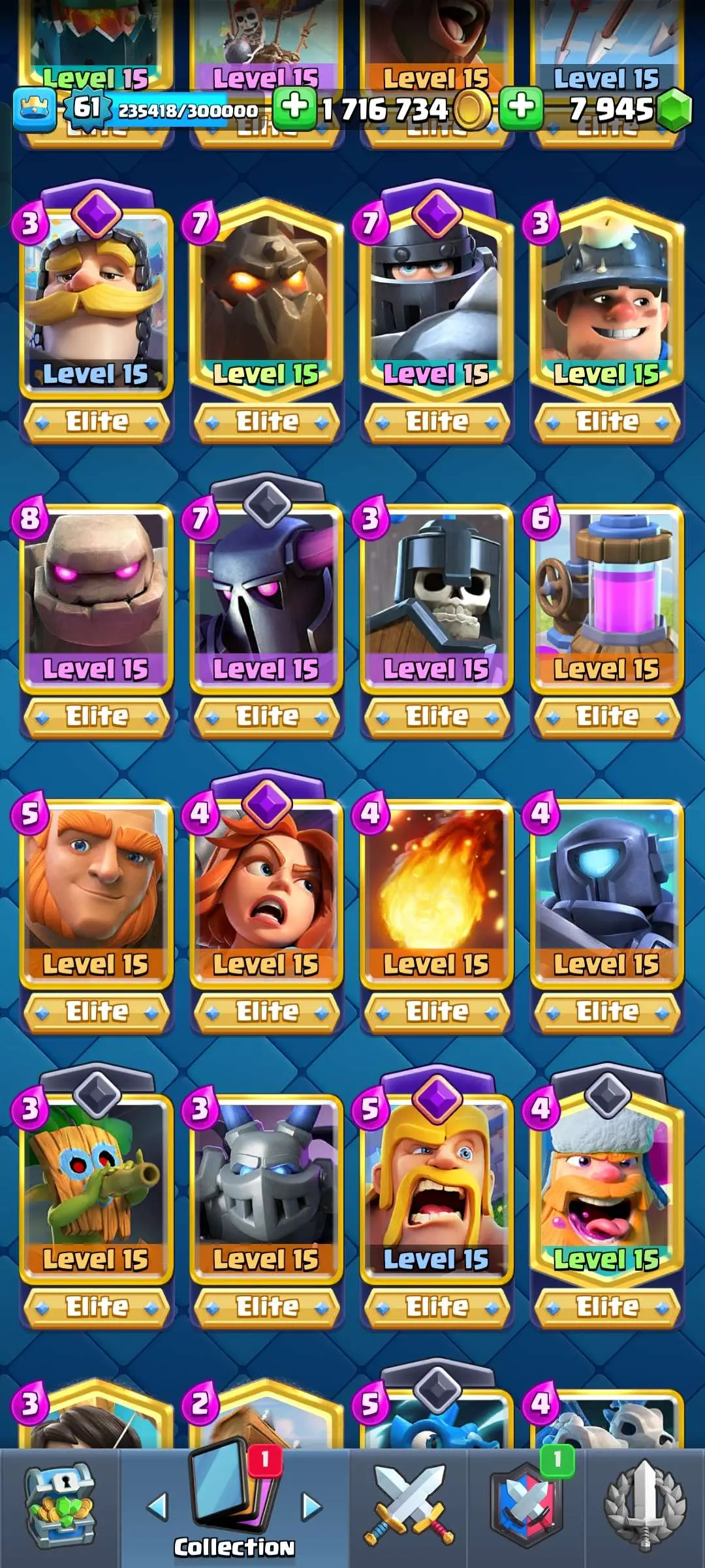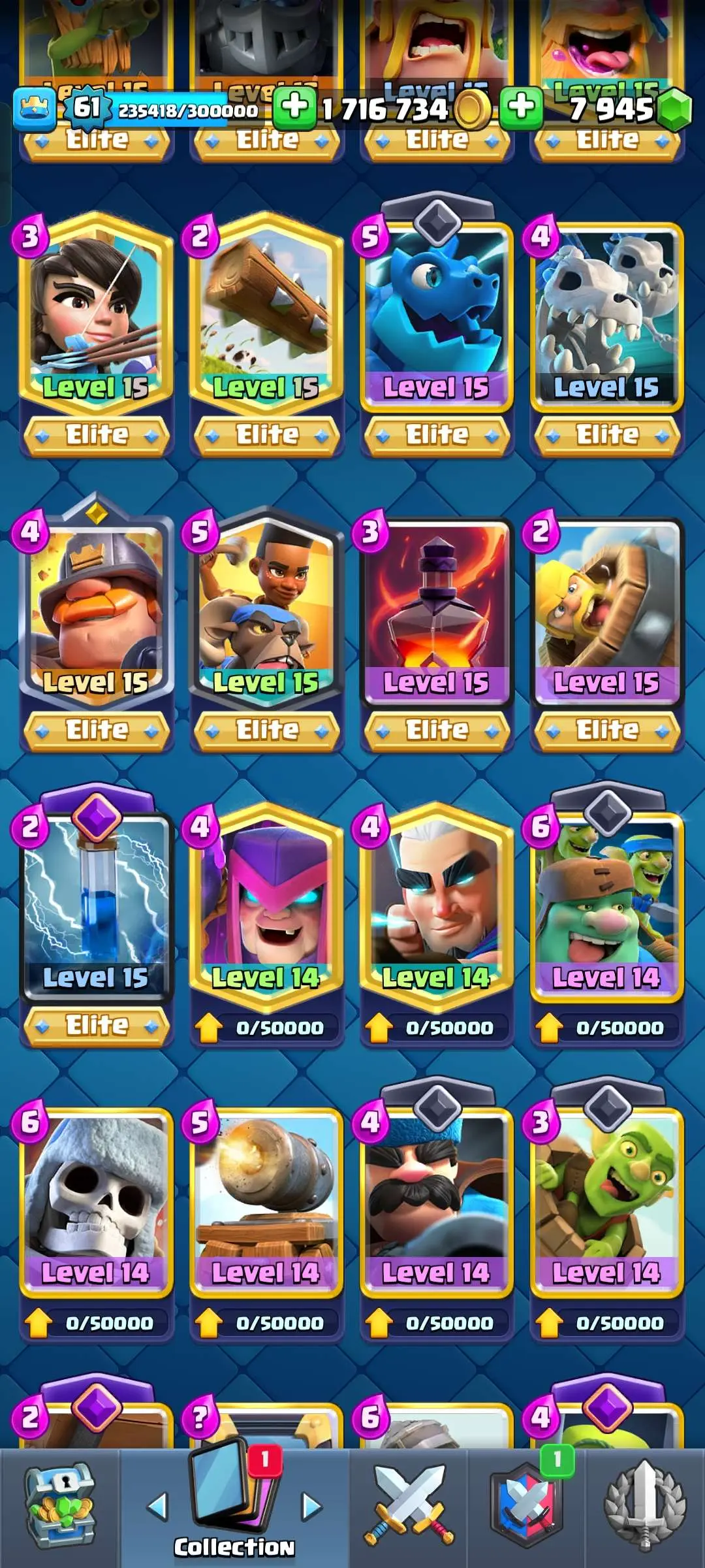 CR Lvl 61 almost 62 ✨ 9000 Trophy ✨ KT 15 ✨ 29 elite cards ✨ 114 max cards ✨ 14 Evo cards ✨ Rare emotes ✨ 1.7M coins ✨7.9 K Gems ✨ 180 emotes ✨ 24 Tower skins