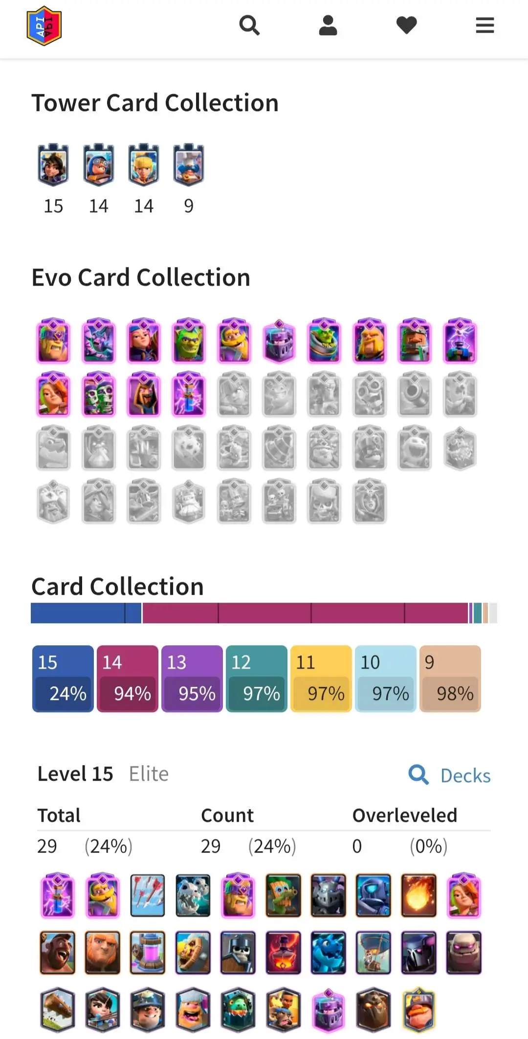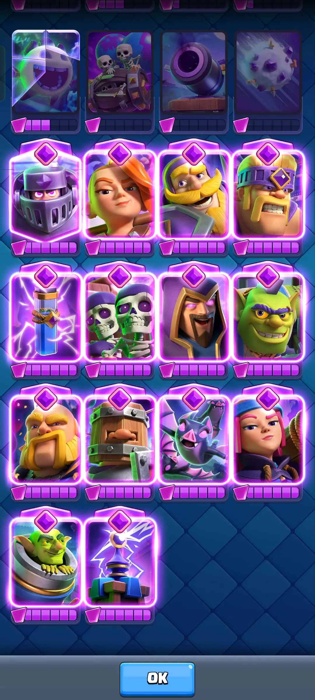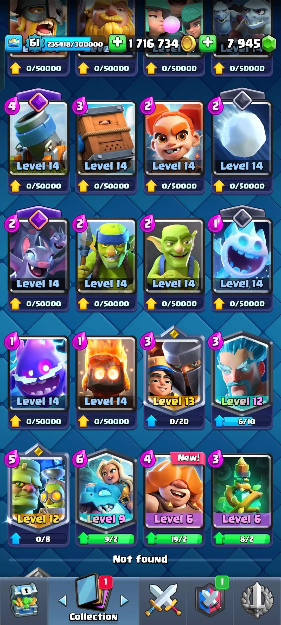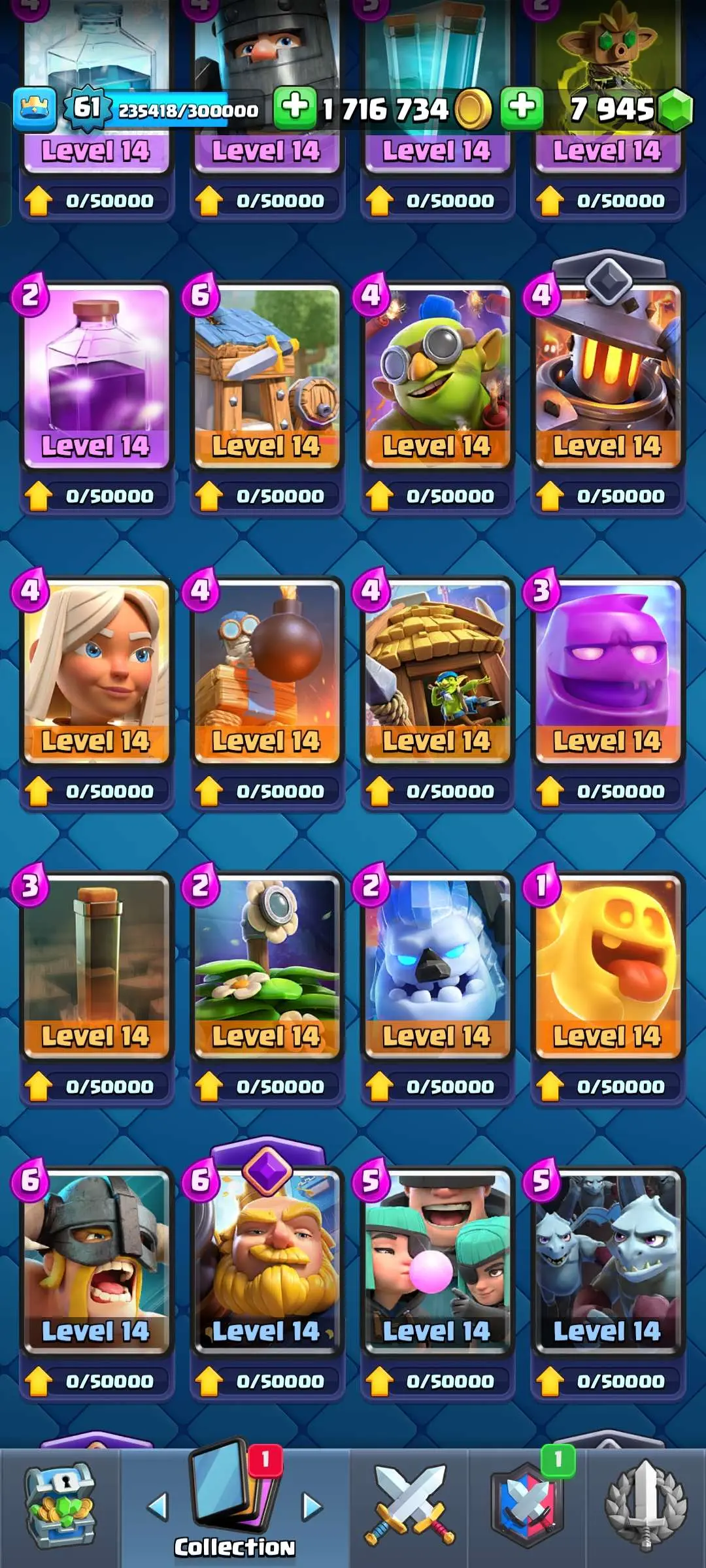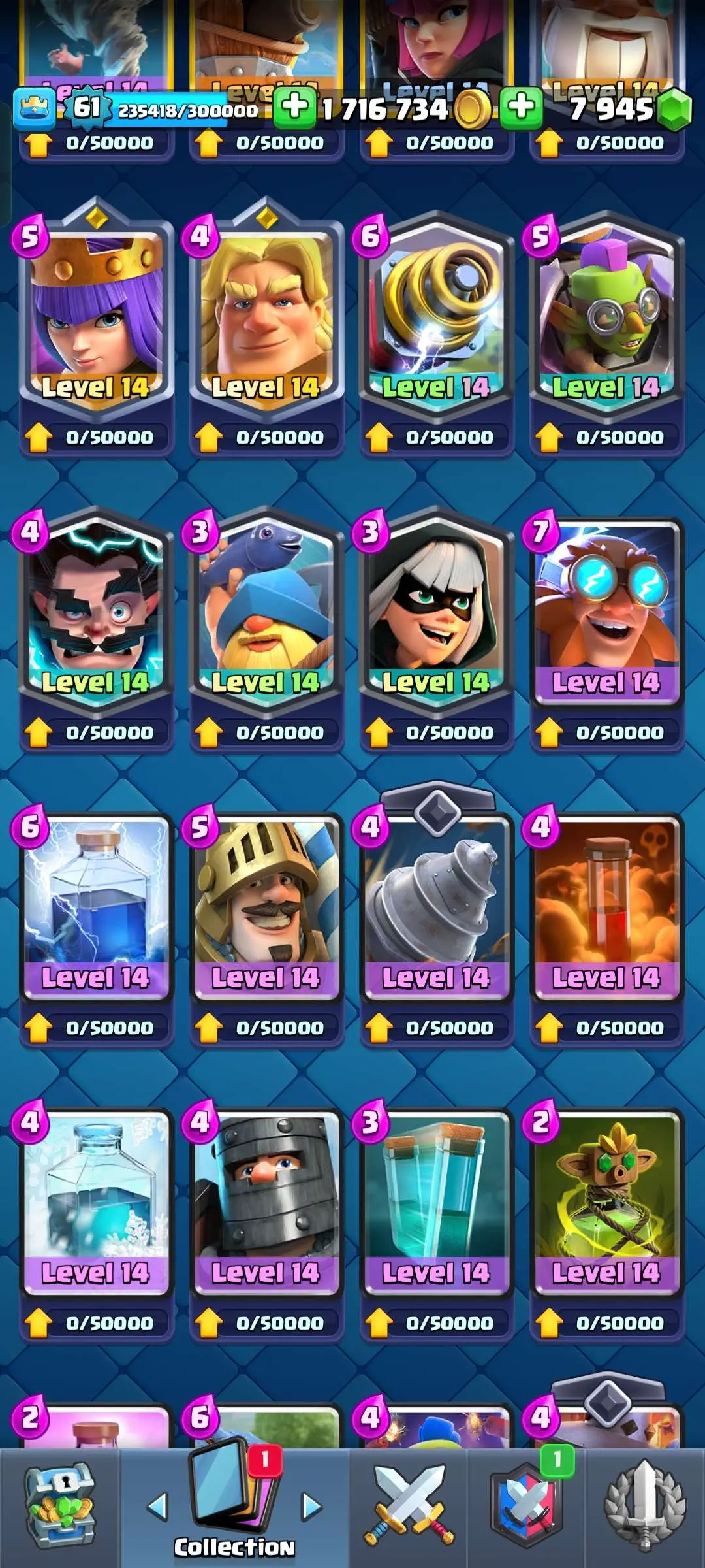 CR Lvl 61 almost 62 ✨ 9000 Trophy ✨ KT 15 ✨ 29 elite cards ✨ 114 max cards ✨ 14 Evo cards ✨ Rare emotes ✨ 1.7M coins ✨7.9 K Gems ✨ 180 emotes ✨ 24 Tower skins