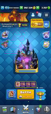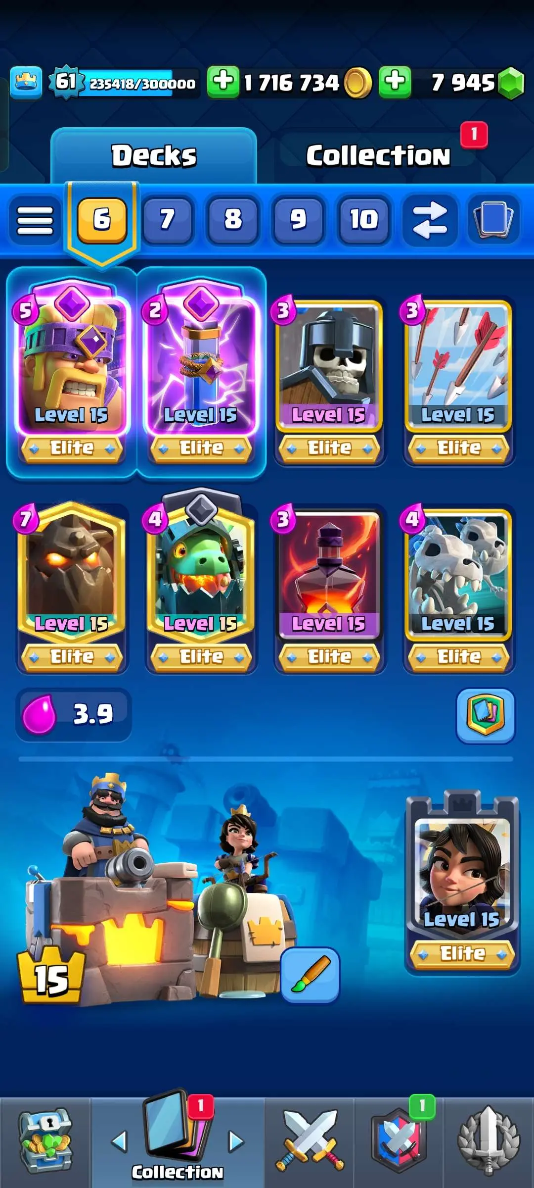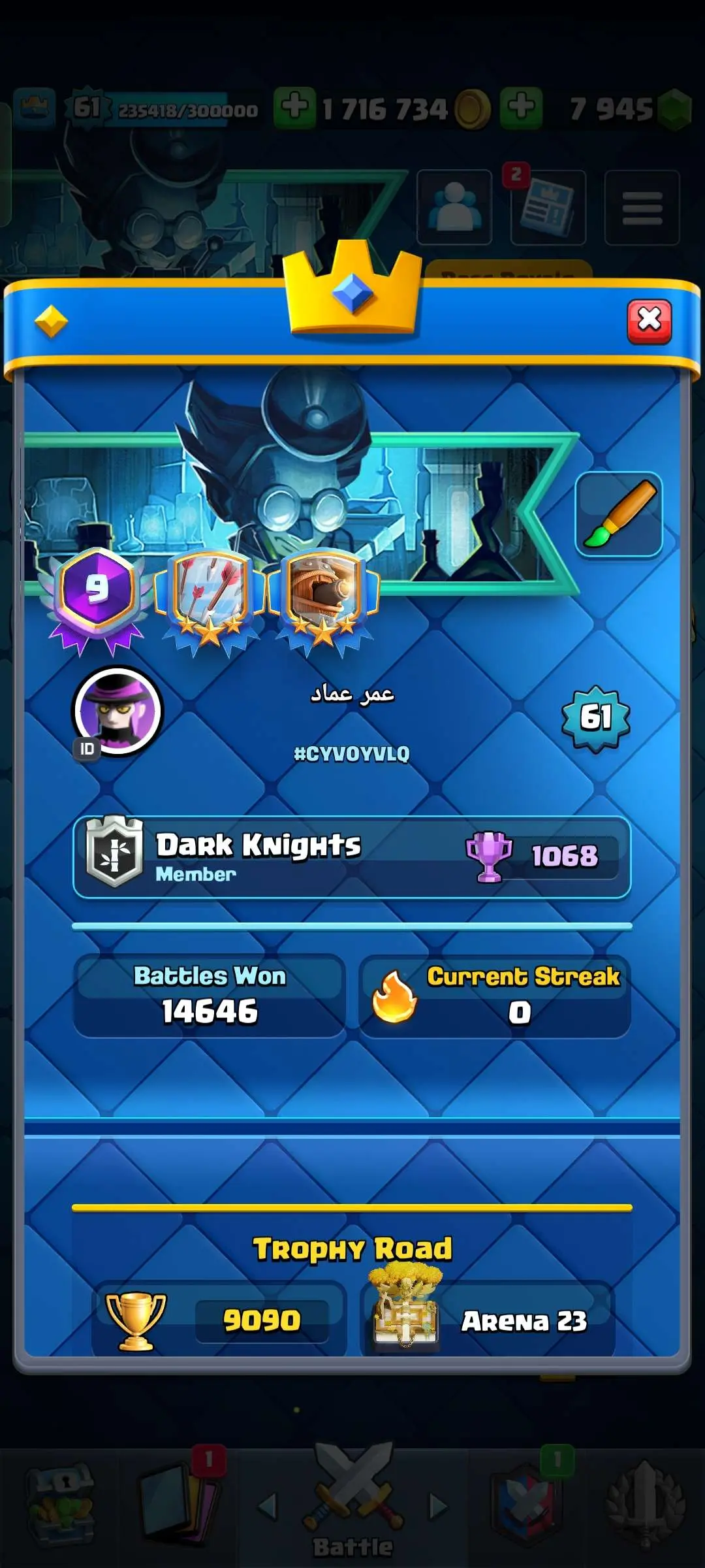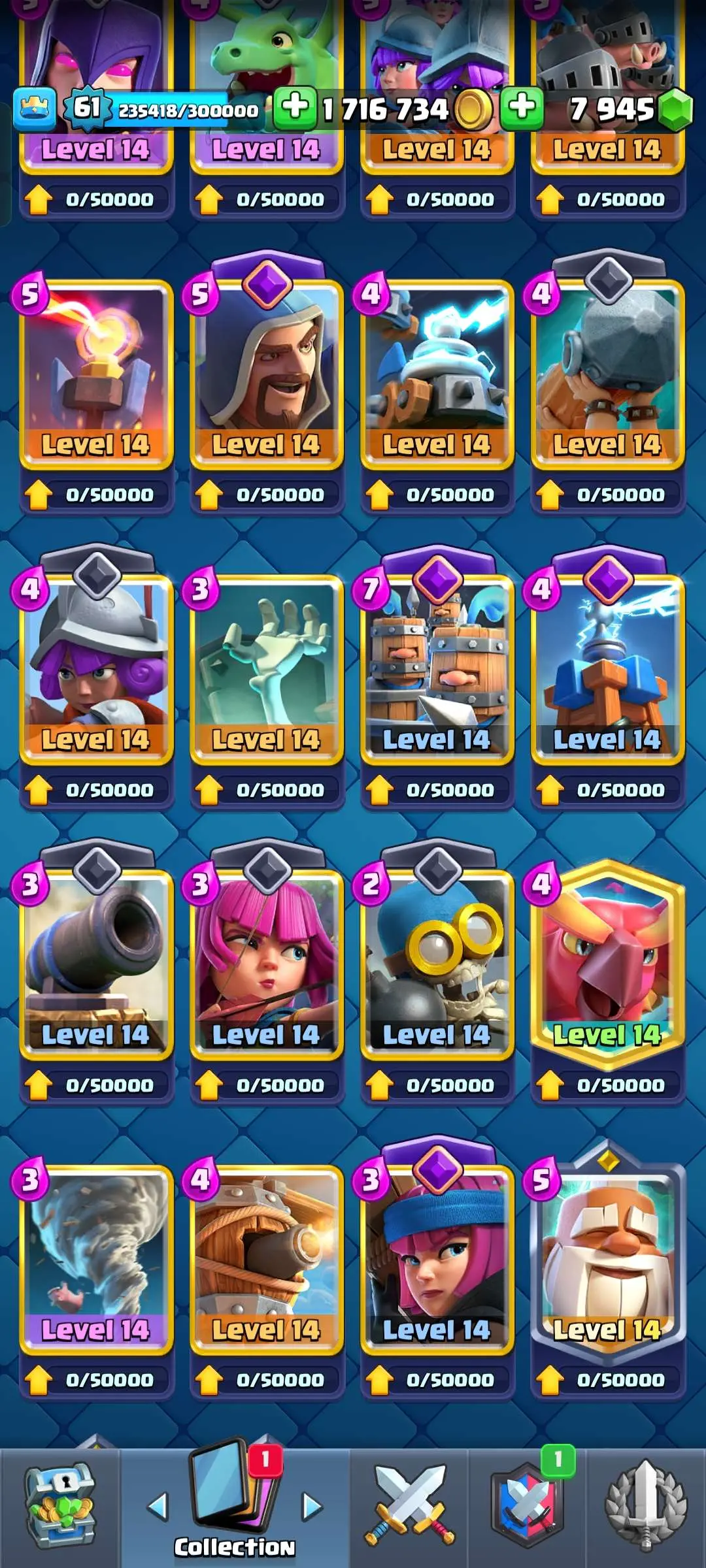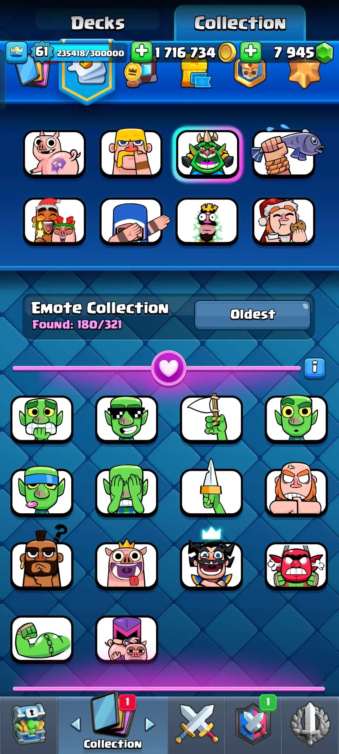 CR Lvl 61 almost 62 ✨ 9000 Trophy ✨ KT 15 ✨ 29 elite cards ✨ 114 max cards ✨ 14 Evo cards ✨ Rare emotes ✨ 1.7M coins ✨7.9 K Gems ✨ 180 emotes ✨ 24 Tower skins