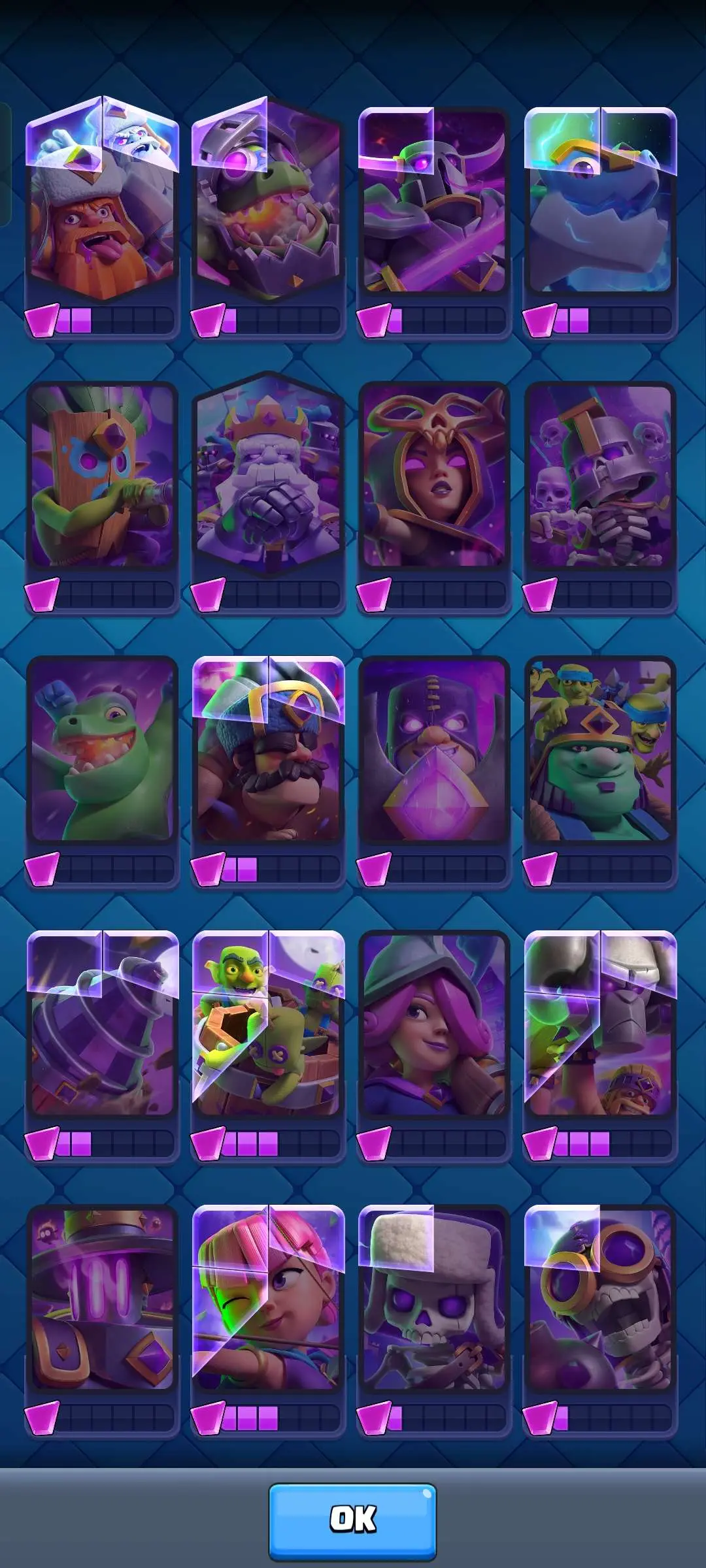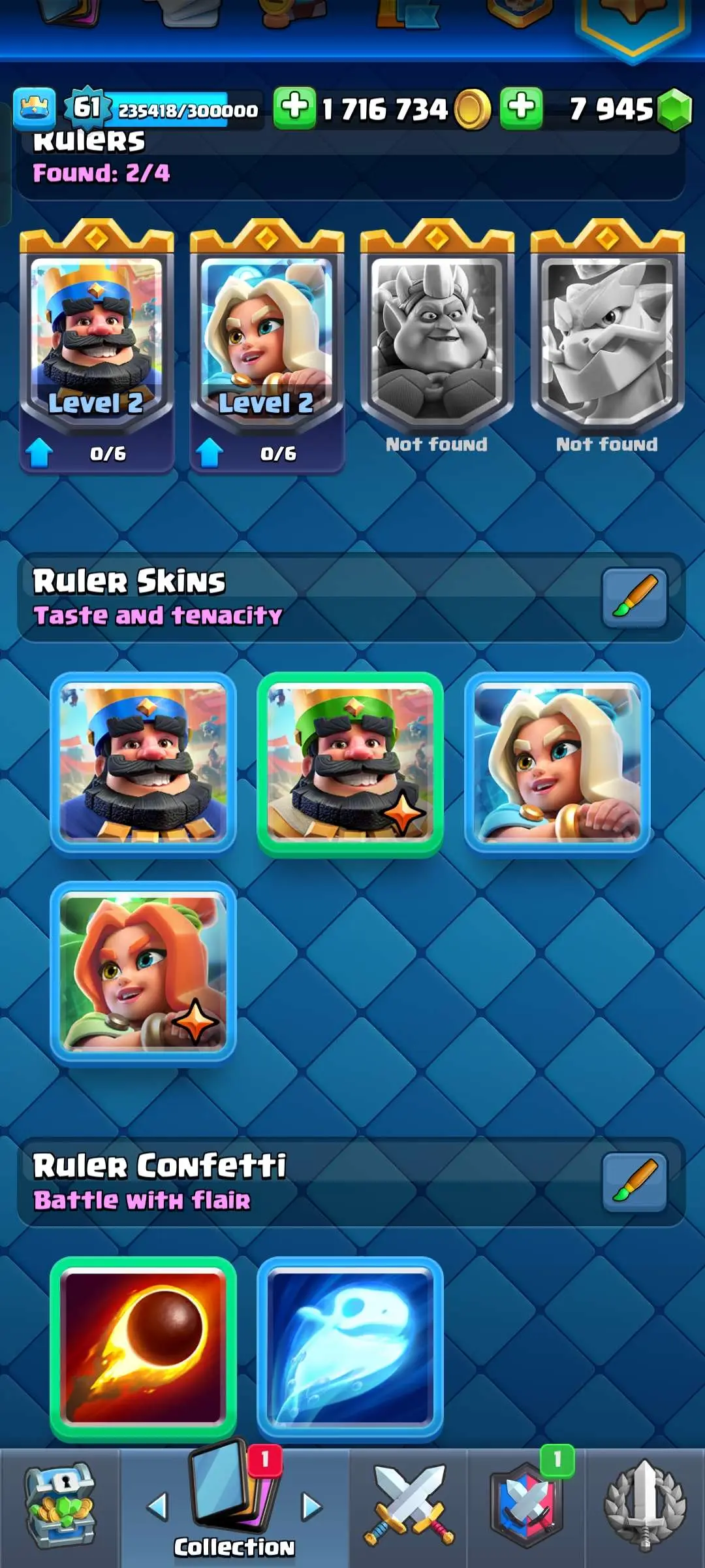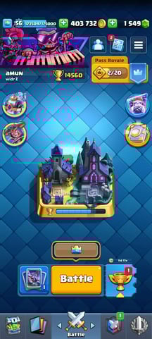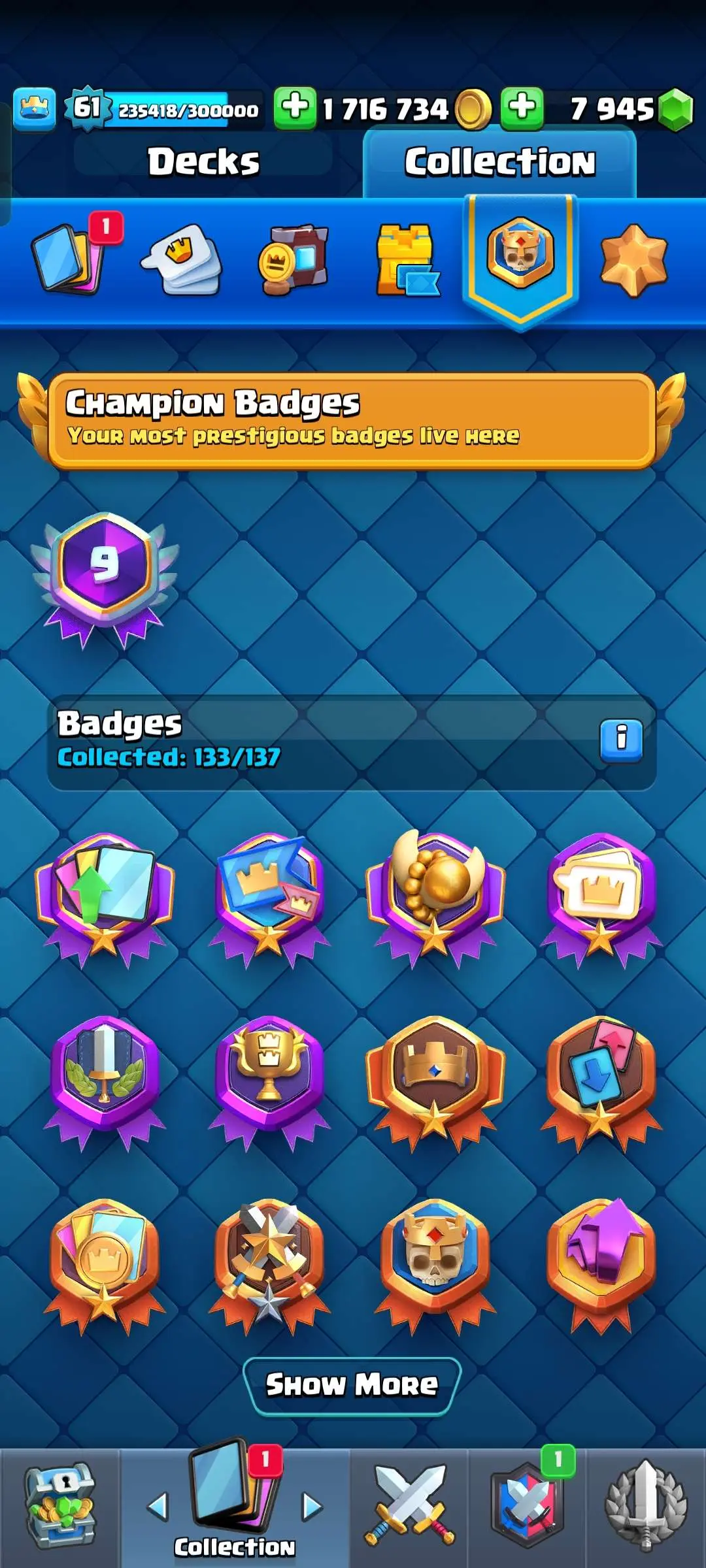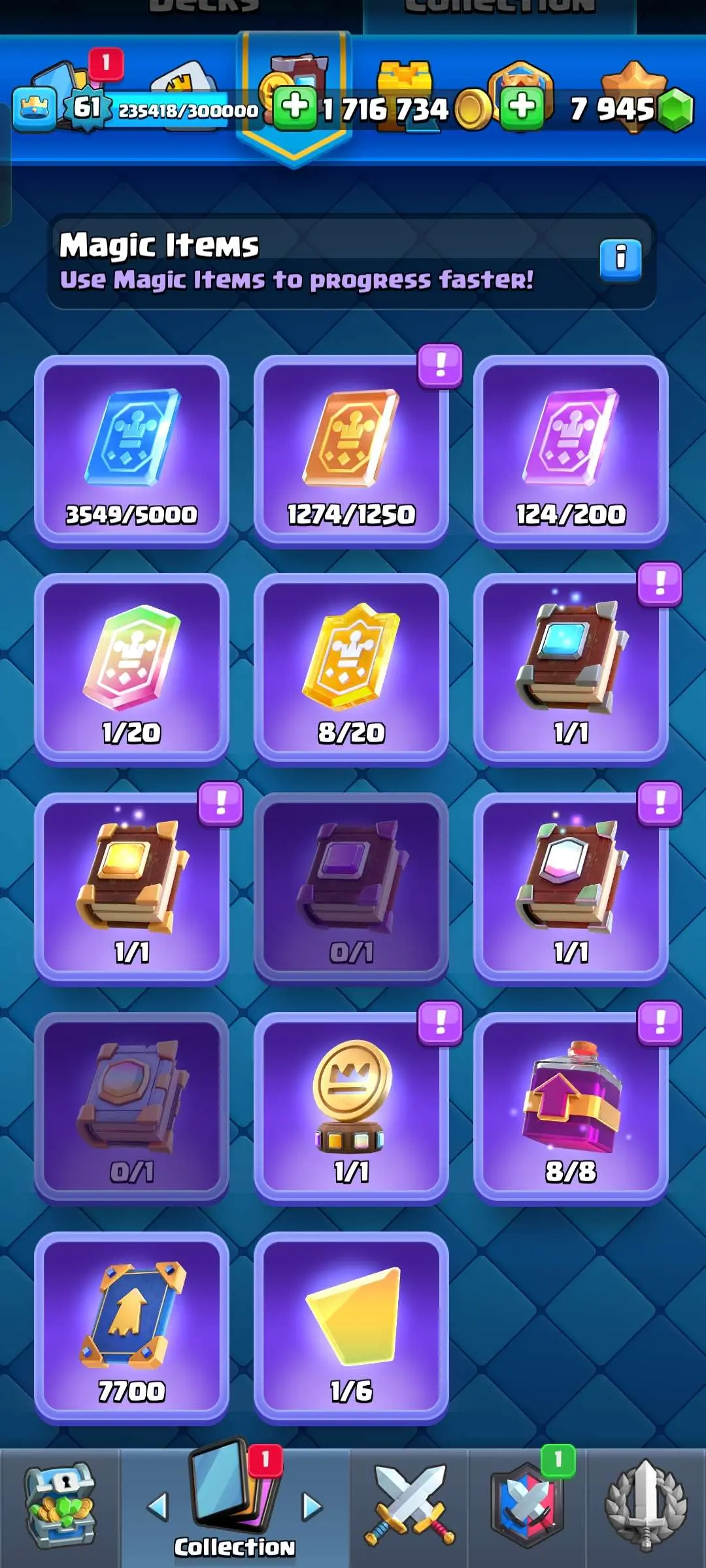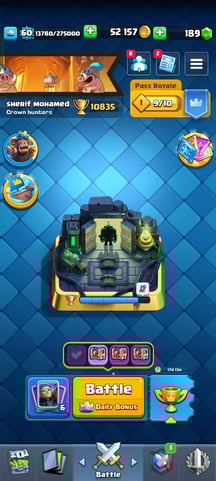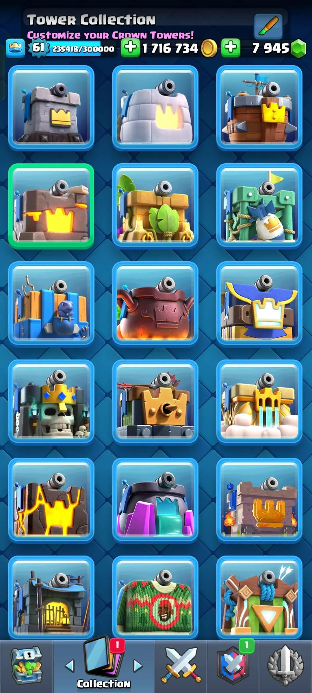 CR Lvl 61 almost 62 ✨ 9000 Trophy ✨ KT 15 ✨ 29 elite cards ✨ 114 max cards ✨ 14 Evo cards ✨ Rare emotes ✨ 1.7M coins ✨7.9 K Gems ✨ 180 emotes ✨ 24 Tower skins