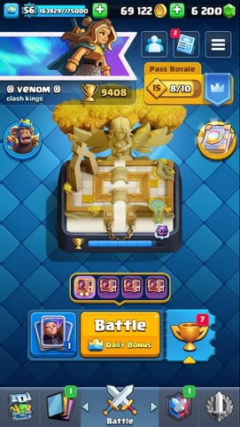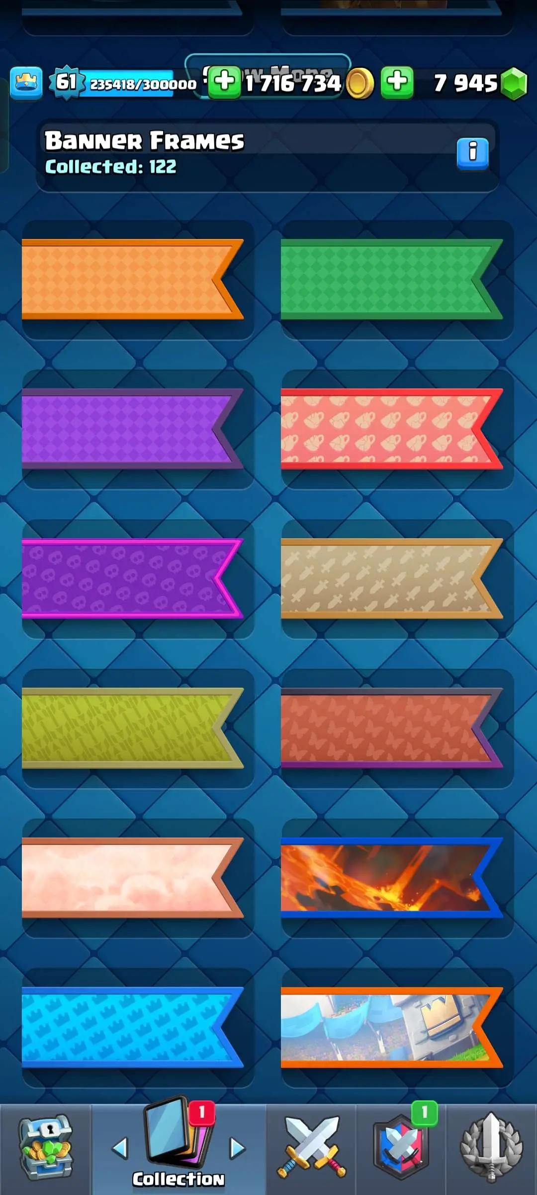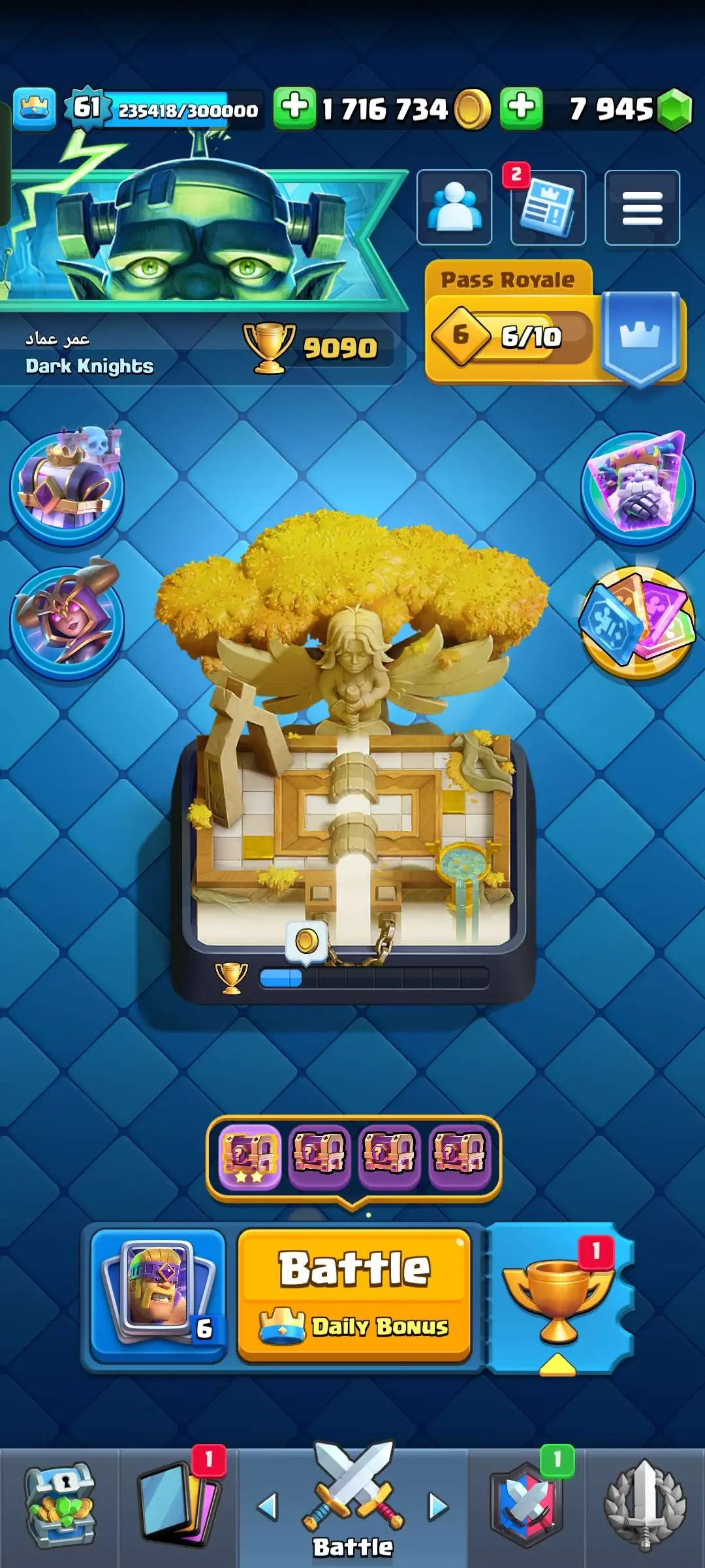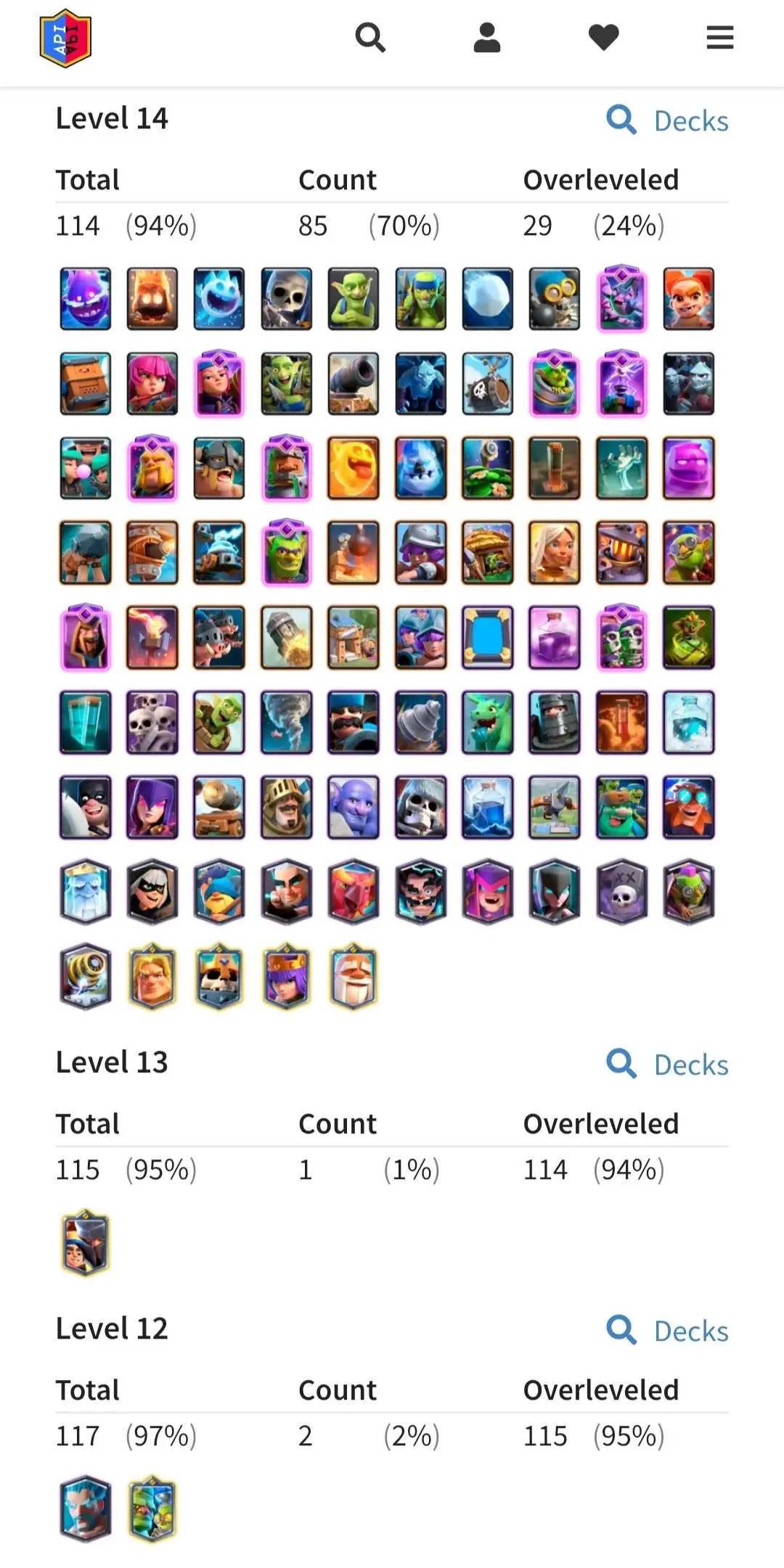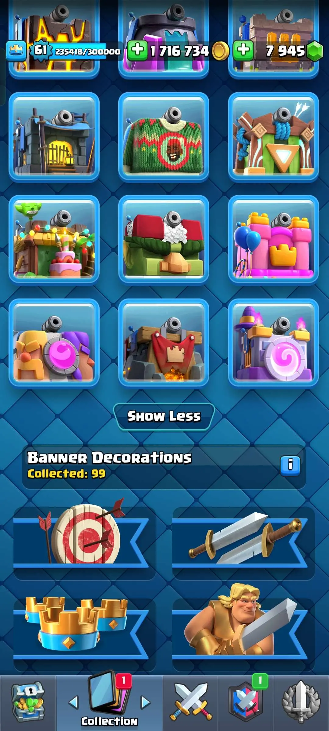 CR Lvl 61 almost 62 ✨ 9000 Trophy ✨ KT 15 ✨ 29 elite cards ✨ 114 max cards ✨ 14 Evo cards ✨ Rare emotes ✨ 1.7M coins ✨7.9 K Gems ✨ 180 emotes ✨ 24 Tower skins