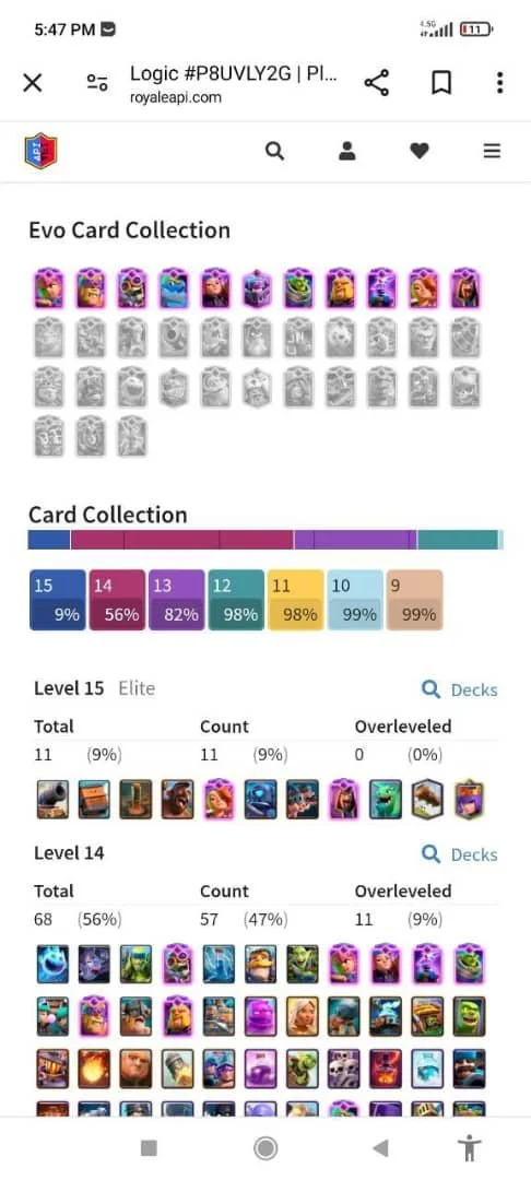 👑KT 15 •⚜️LV 58 • 🧬11 Evolution/68 max/11 elite🏆 7560 Trophies • 🃏 121/121Cards• 💎 15300 Gems •(#A53478893f)