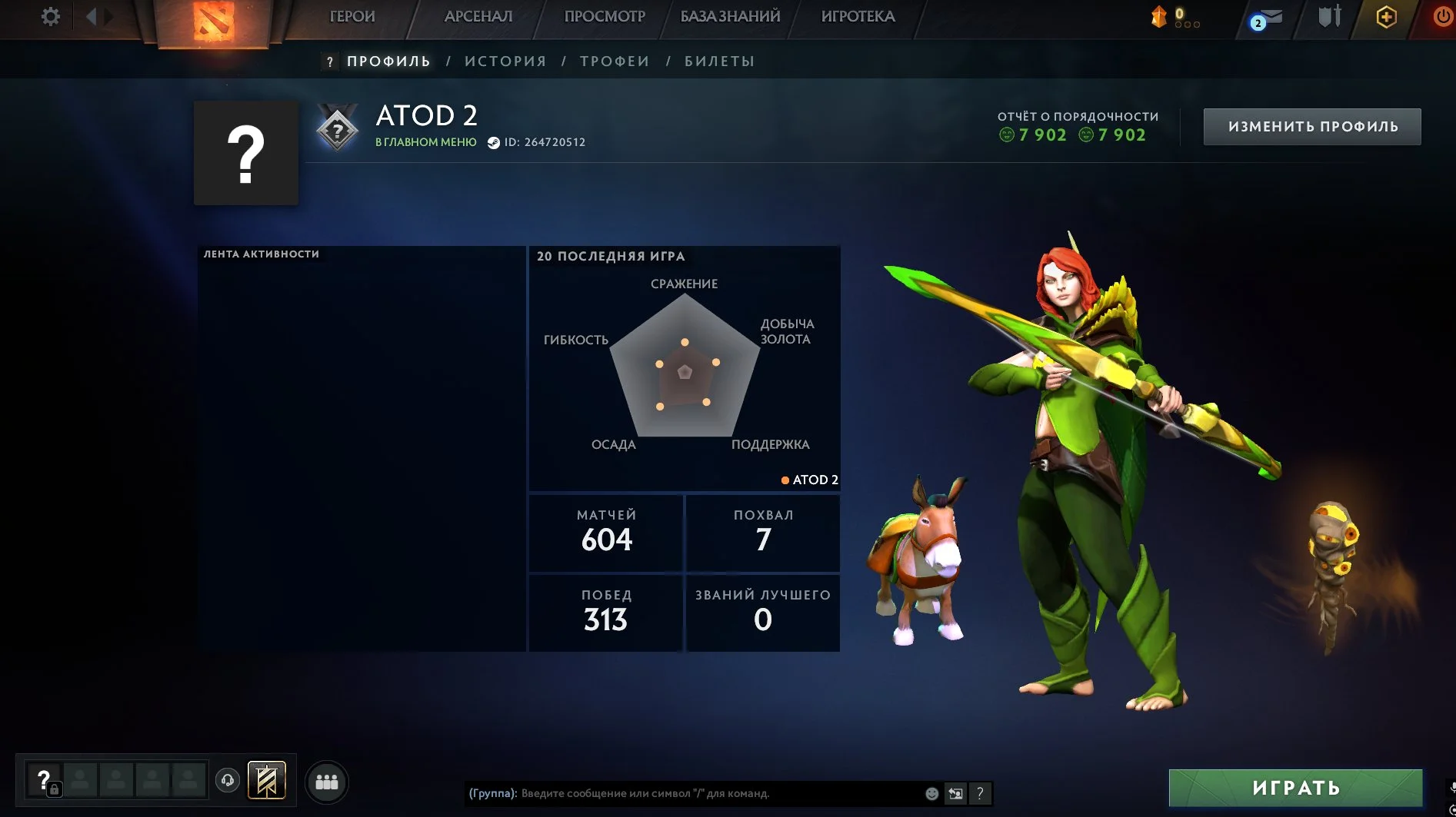 DO360//Dota 2 Account 1200 MMR 7902 Behavior Score 25 Trophy Level 604 Matches