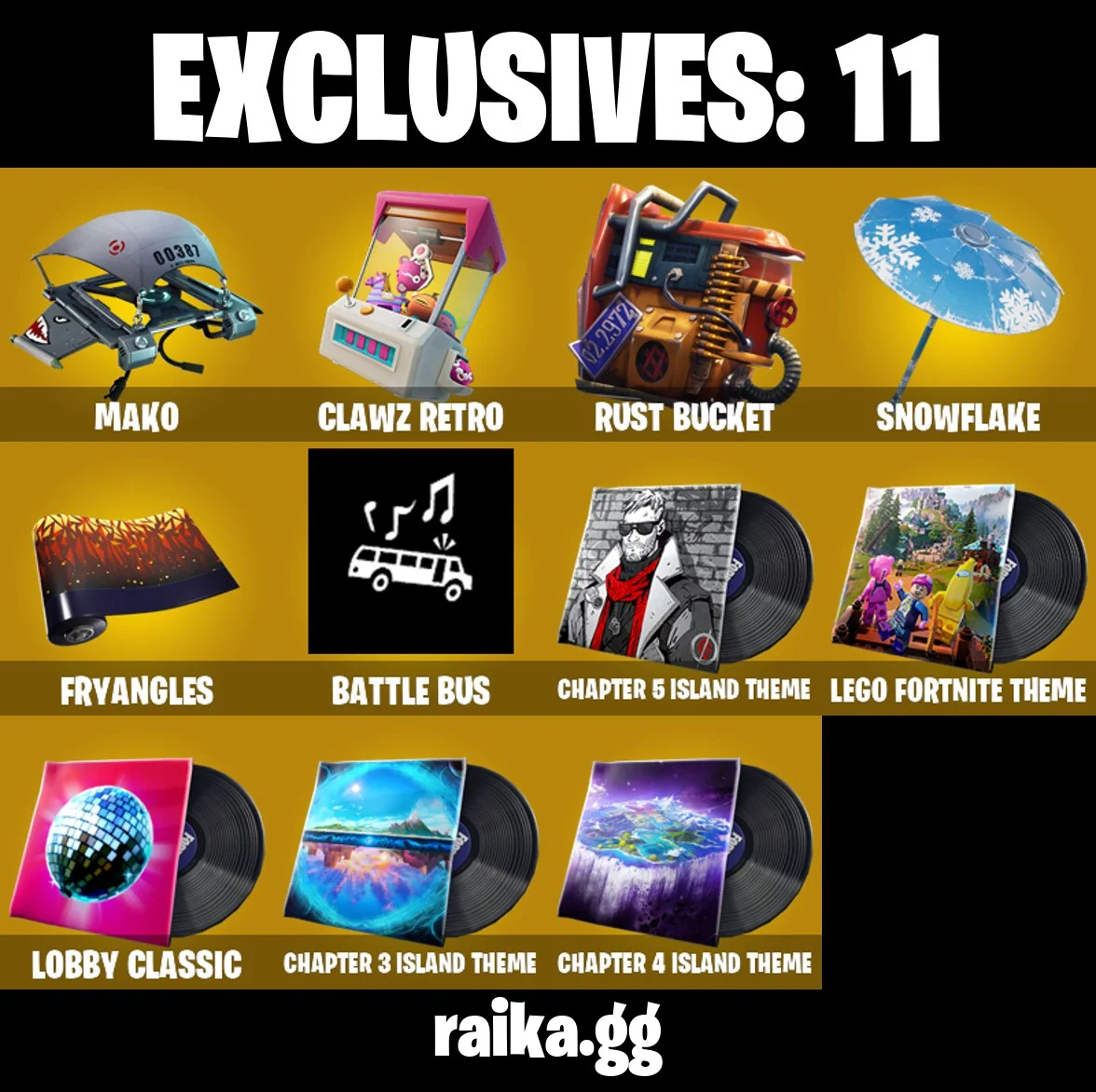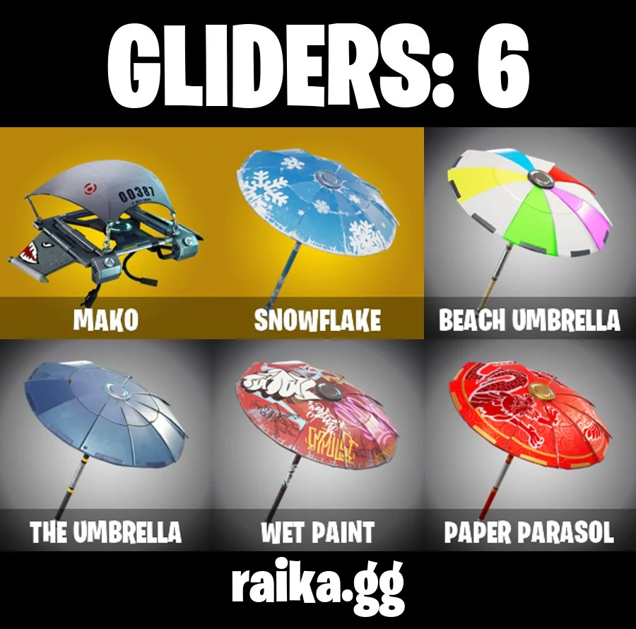 0 skins | Clawz Retro | Rust Bucket | Salute | Wave | Mako | Snowflake | Beach Umbrella | The Umbrella | Wet Paint | Paper Parasol | Battle Bus | 100 VB
