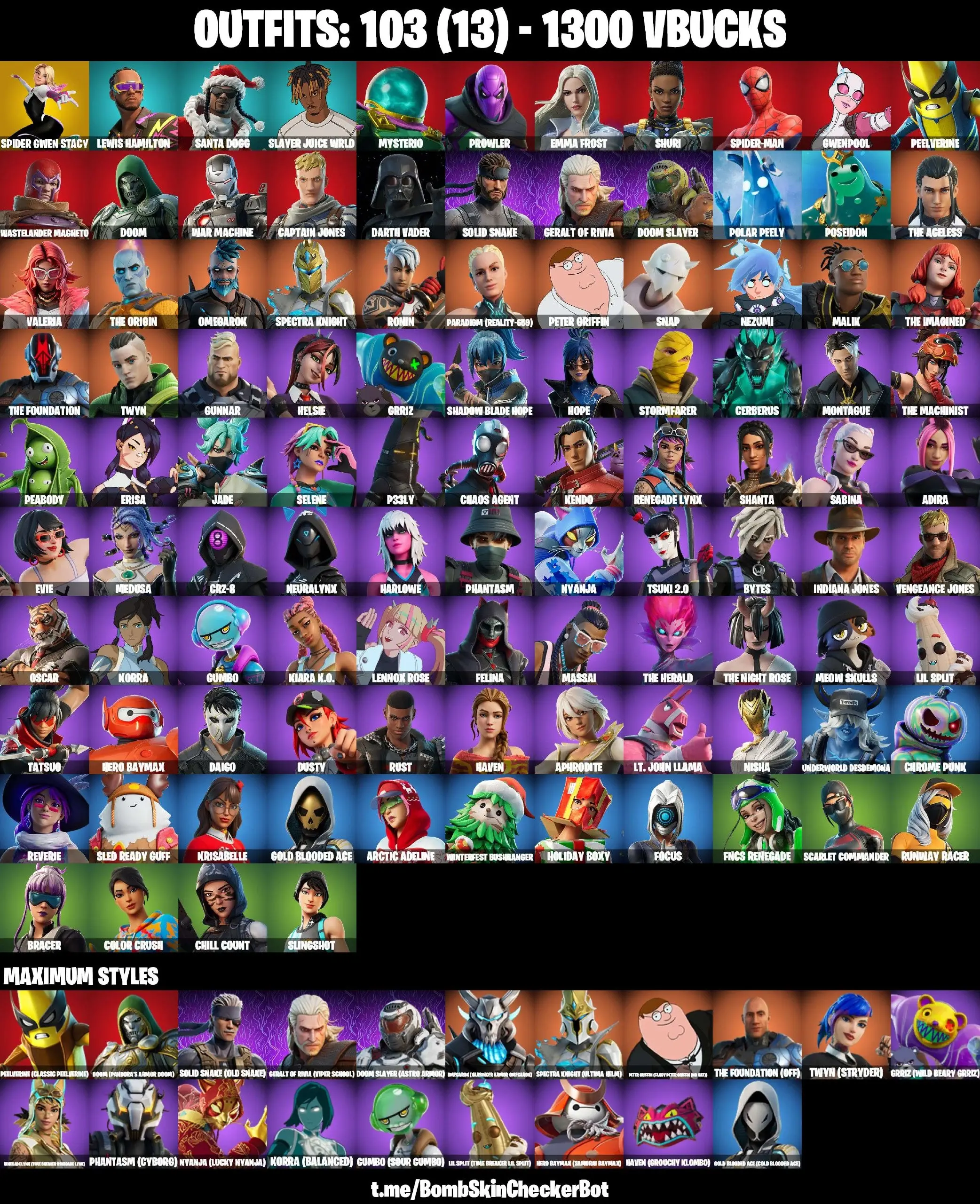 ❤️ 103 SKINS ❤️ SPIDER-GWEN STACY ❤️ SPIDER-MAN ❤️ DARTH VADER ❤️ HELSIE ❤️ CHAOS AGENT ❤️ EVIE ❤️ TSUKI 2.0 ❤️ REVERIE ❤️ MEOW SKULLS ❤️ P33LY ❤️ SCARLET COMMANDER ❤️ FNCS RENEDE ❤️ COLOR CRUSH ❤️ CAN PLAY ON PSN ❤️ XBOX ❤️ PC ❤️