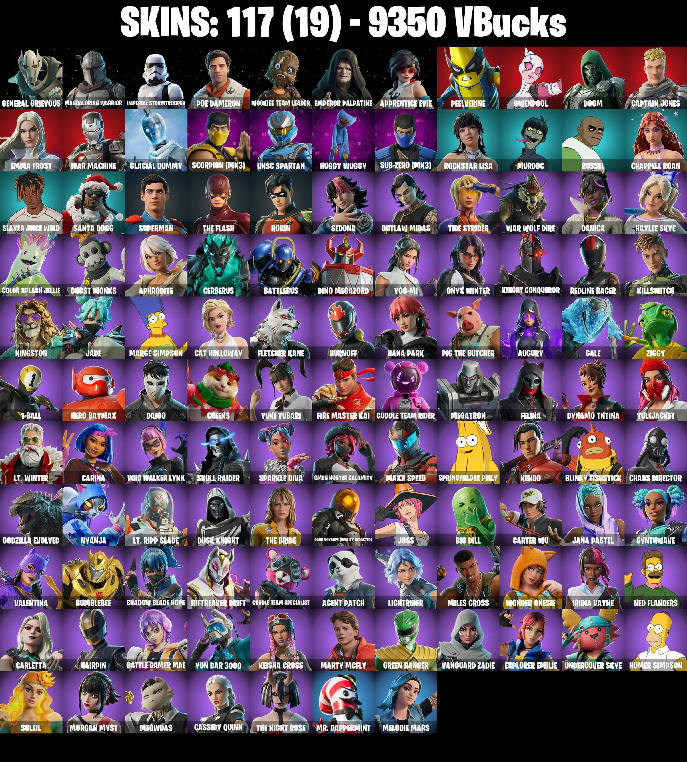 117 SKINS 💙 General Grievous 💙 Mandalorian Warrior 💙 Imperial Stormtrooper 💙 Poe Dameron 💙 Wookiee Team Leader 💙 9350 V-Bucks (PC/PSN/XBOX) PARENTAL CONTROL