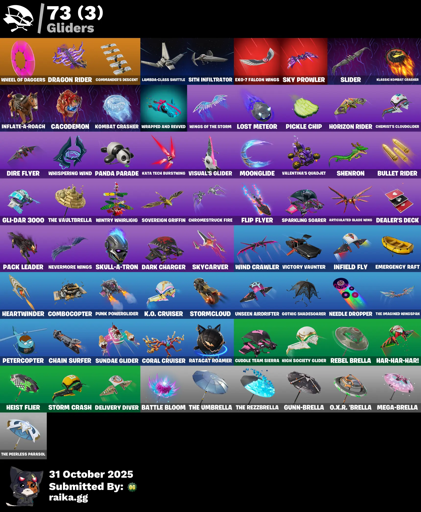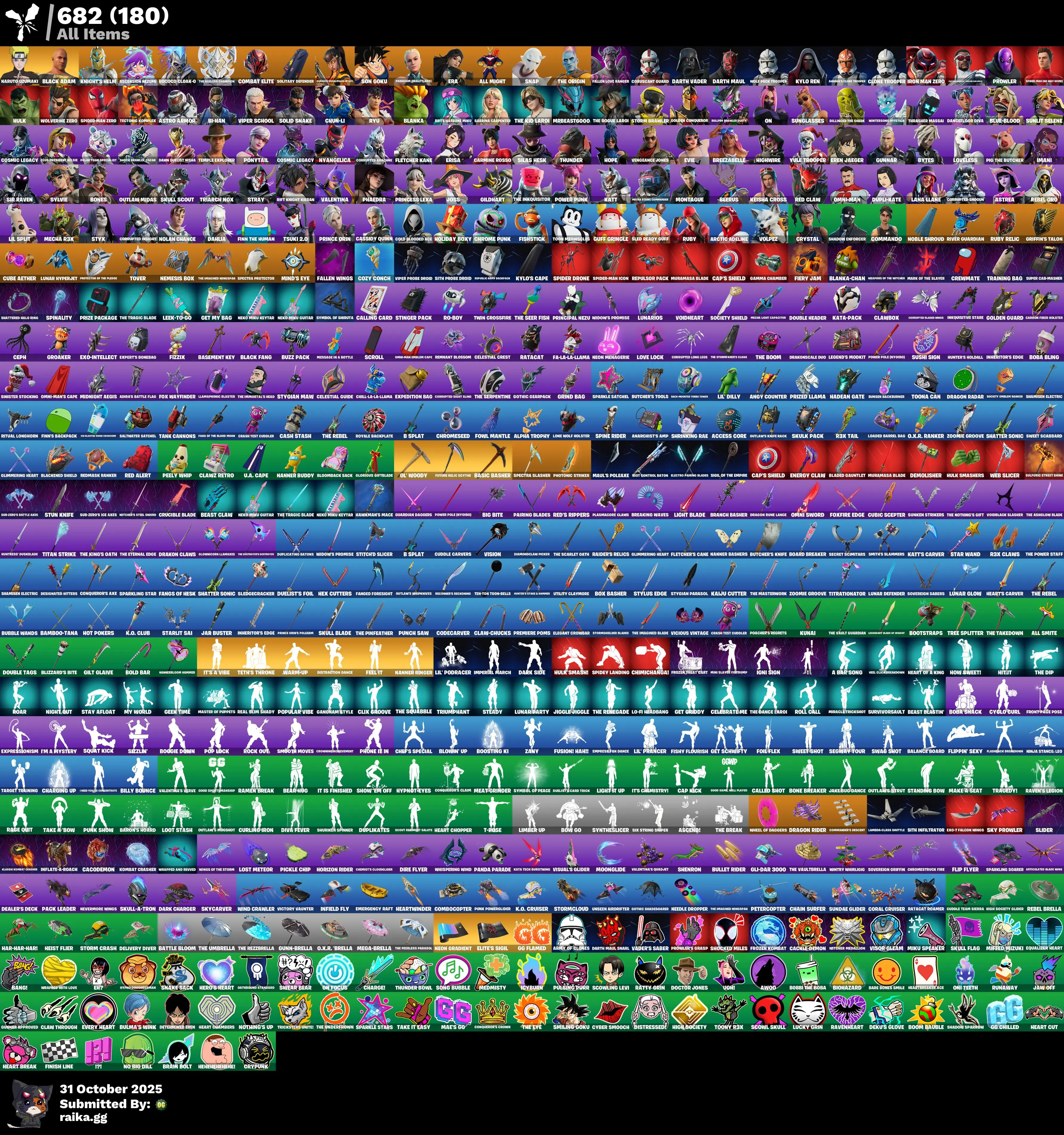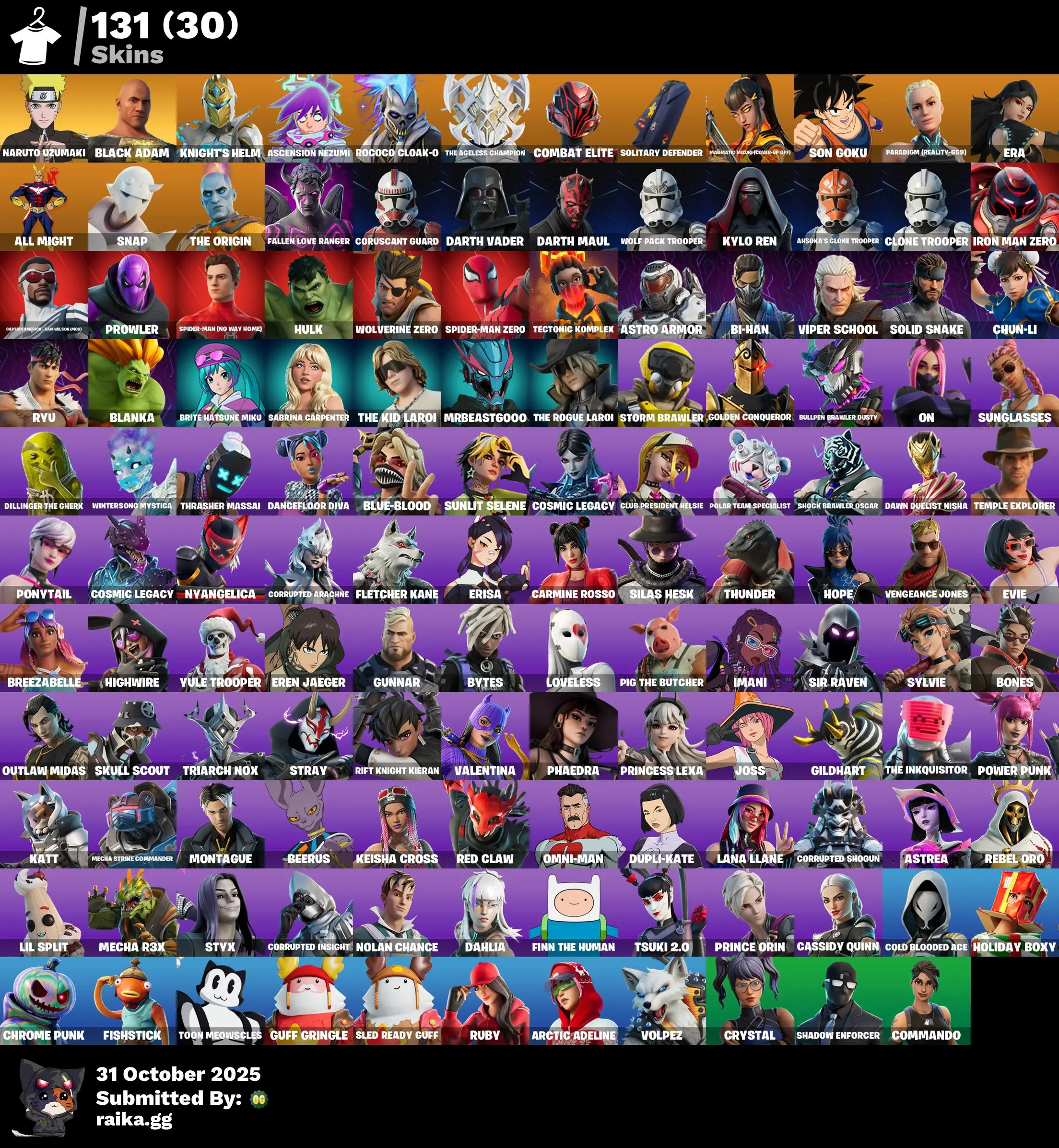 131 skins | Chun-Li🎃Eren Jaeger🎃Son Goku🎃All Might🎃Naruto Uzumaki🎃Get Griddy🎃Spider-Man (No Way Home)🎃Darth Maul🎃Valentina's Quadjet🎃Nezumi🎃The Scarlet Oath🎃Kaiju Cutter🎃Stormcloud🎃The Imagined🎃Nanner Ringer🎃!🎃Ahsoka's Clone Trooper D5276