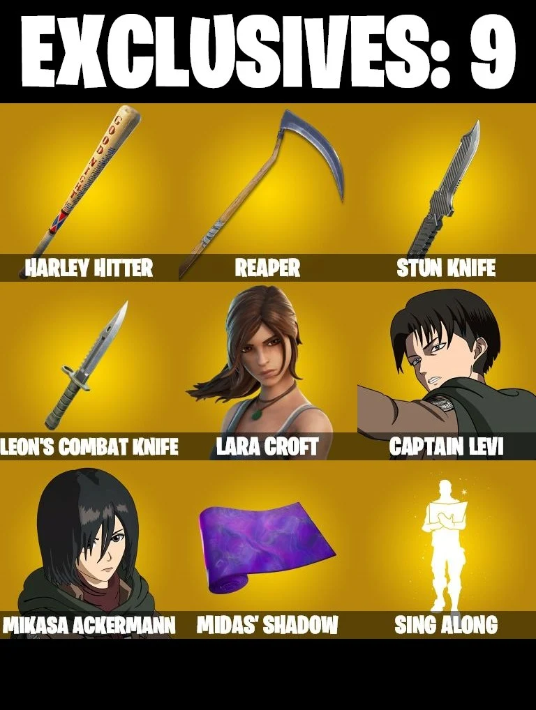 👑180 Skins 👑PC/PSN/XBOX👑 Captain Levi 👑 Mikasa Ackermann 👑 Sing Along 👑 Lara Croft 👑 Neymar Jr 👑 Eren Jaeger 👑 Jules 👑 A Goat 👑 Harley Hitter👑