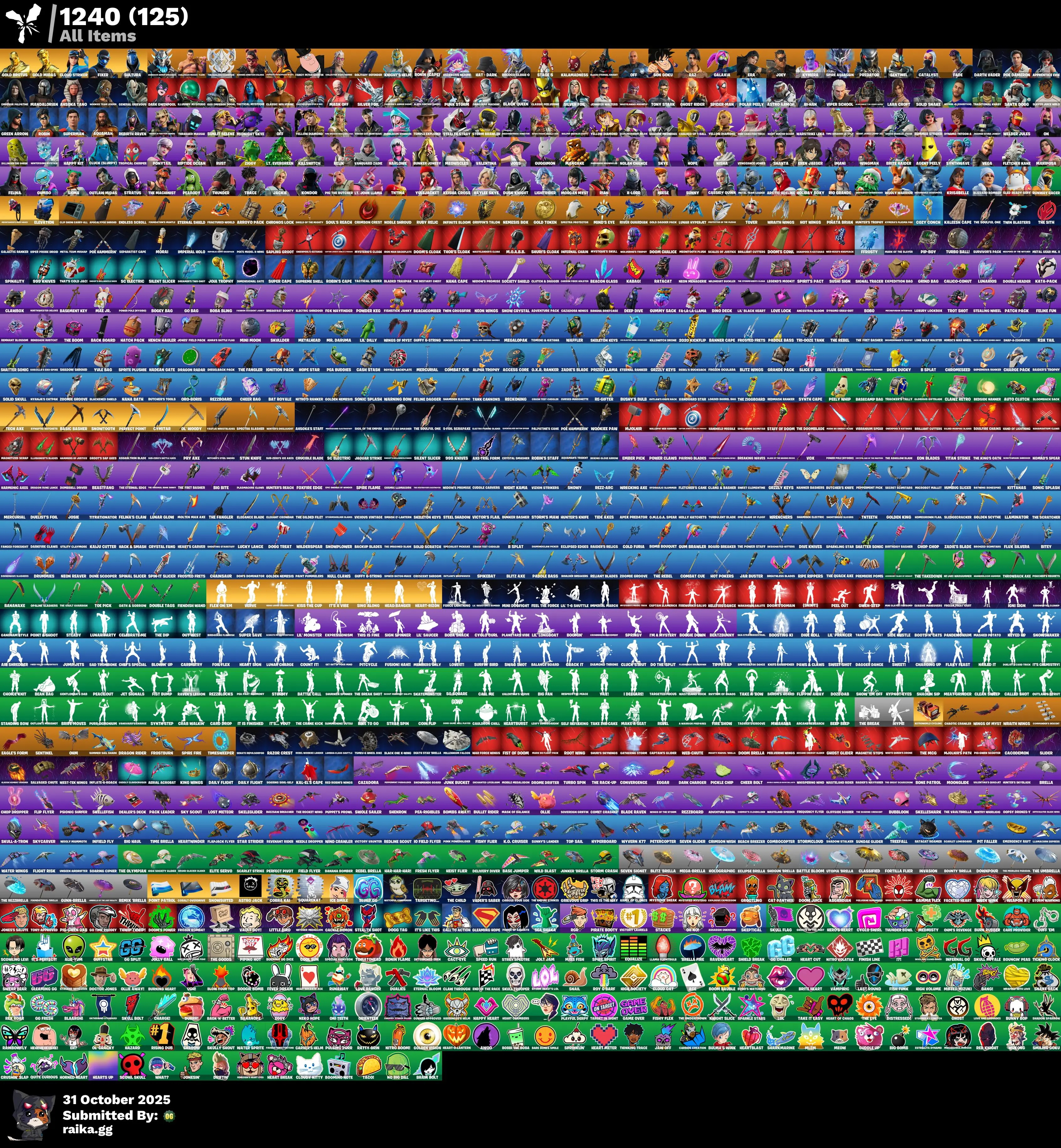 181 skins | Eren Jaeger🎃Son Goku🎃Gold Midas🎃Kiss The Cup🎃Spider-Man🎃Lara Croft🎃Head Banger🎃Jules🎃General Grievous🎃Predator🎃Ollie🎃Black One X-wing🎃Bone Patrol🎃Krisabelle🎃Skeleglider🎃West-Tek Wings🎃Llaminator🎃Kal-El's Cape D5279
