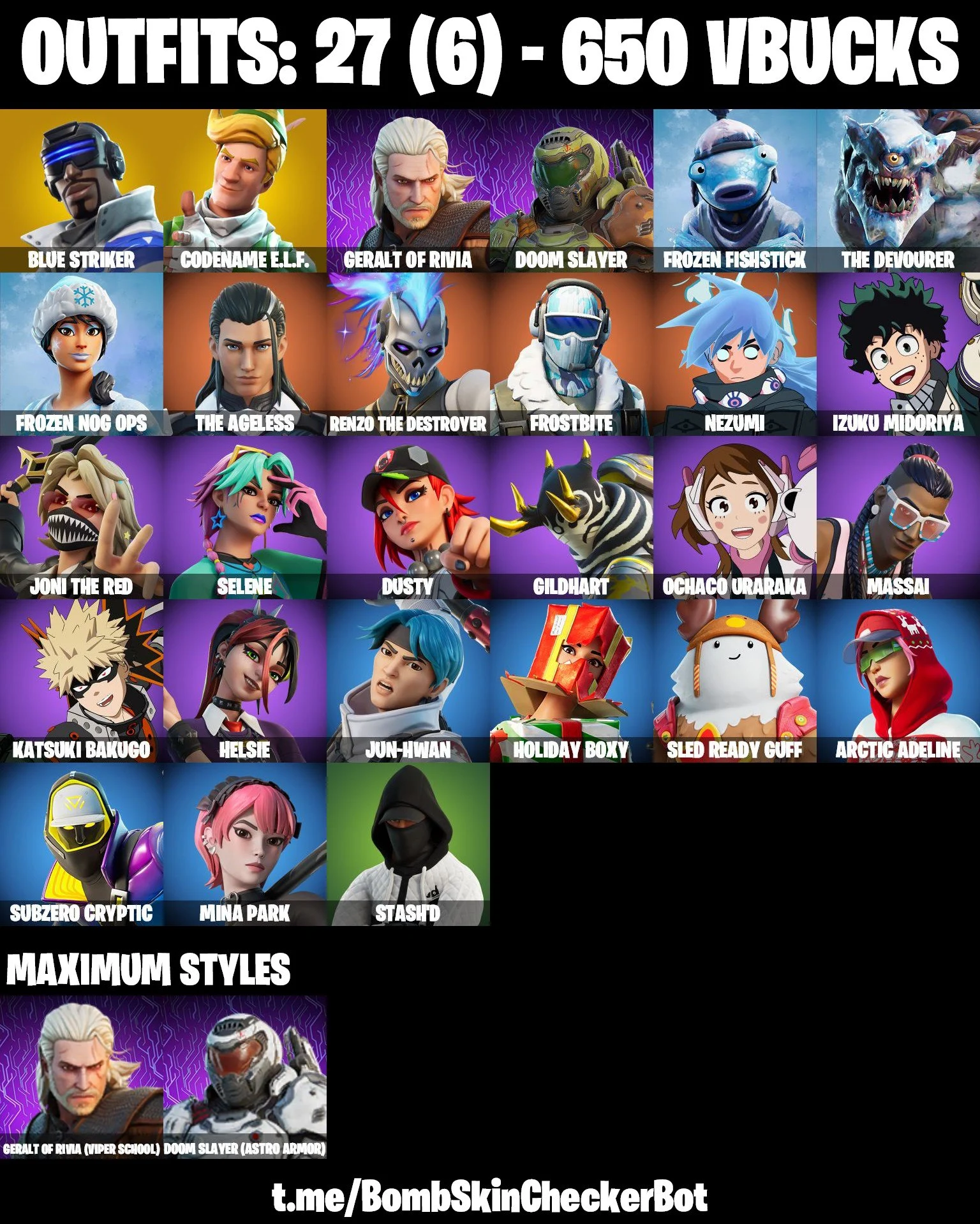 🔮27 Skins🔮 Blue Striker💎Izuku Midoriya💎Ochaco Uraraka💎Katsuki Bakugo💎Doom Slayer💎Geralt Of Rivia💎Arctic Adeline💎Sled Ready Guff💎Holiday Boxy