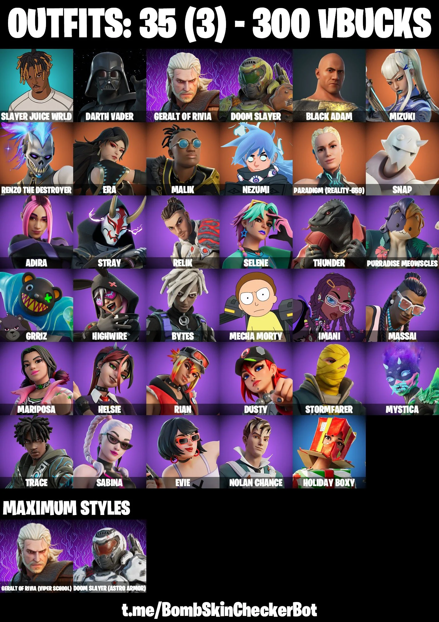 🔮35 Skins🔮 Darth Vader💎Doom Slayer💎Geralt Of Rivia💎Slayer Juice Wrld💎Holiday Boxy