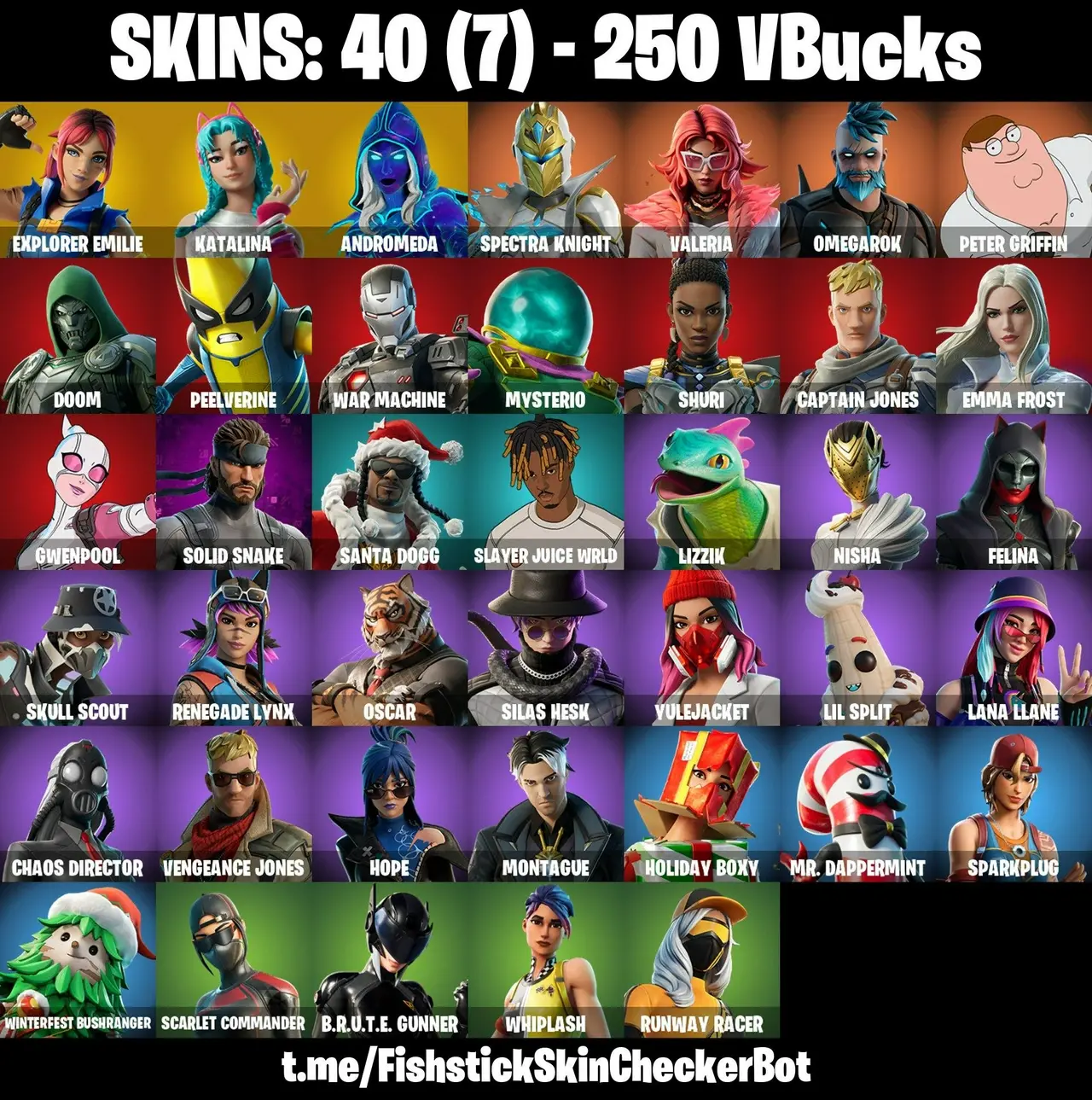 ⚡ 40 Skins [PC/PSN/XBOX] 🛡️ Spectra Knight 🐷 Peter Griffin 🤖 War Machine 🧭 Captain Jones ❄️ Emma Frost 💖 Gwenpool 🎅 Santa Dogg 🚀 FTN35
