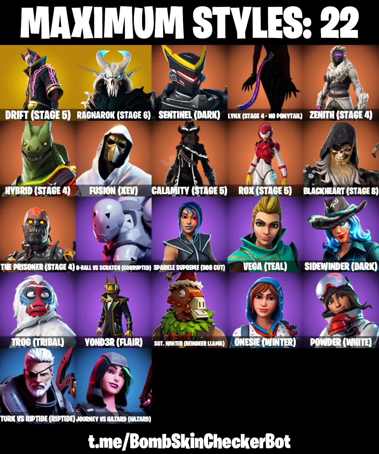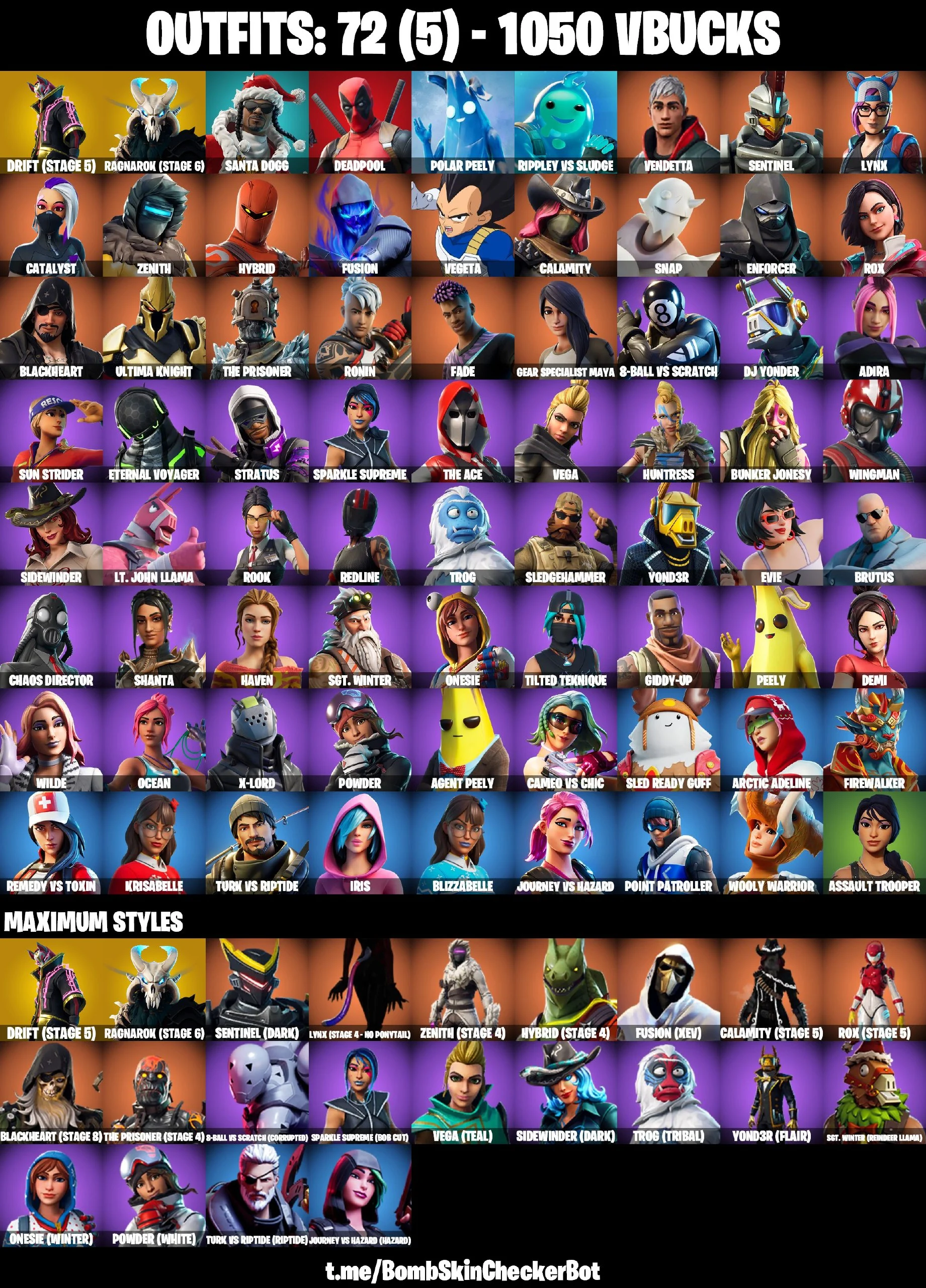 🔮72 Skins🔮 Take The Elf💎Ragnarok (Stage 6)💎Vegeta💎Point Patroller💎Tilted Teknique💎Peely💎Polar Peely💎Blizzabelle💎Krisabelle💎DJ Yonder💎Vendetta💎Ocean💎Fusion💎Arctic Adeline💎Sled Ready Guff