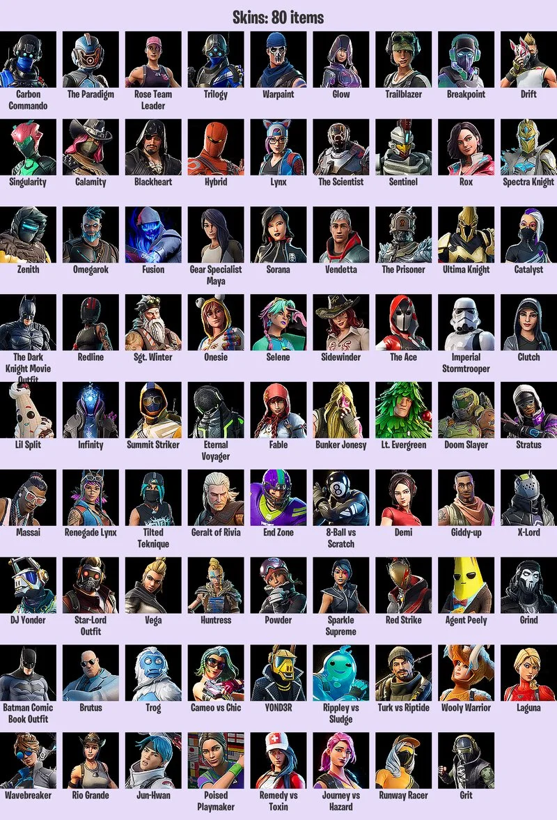 80 Skins|OG STW|Carbon Commando|The Paradigm|Rose Team Leader|Trilogy|Warpaint|Glow|Trailblazer|Breakpoint|Drift|Singularity|Calamity