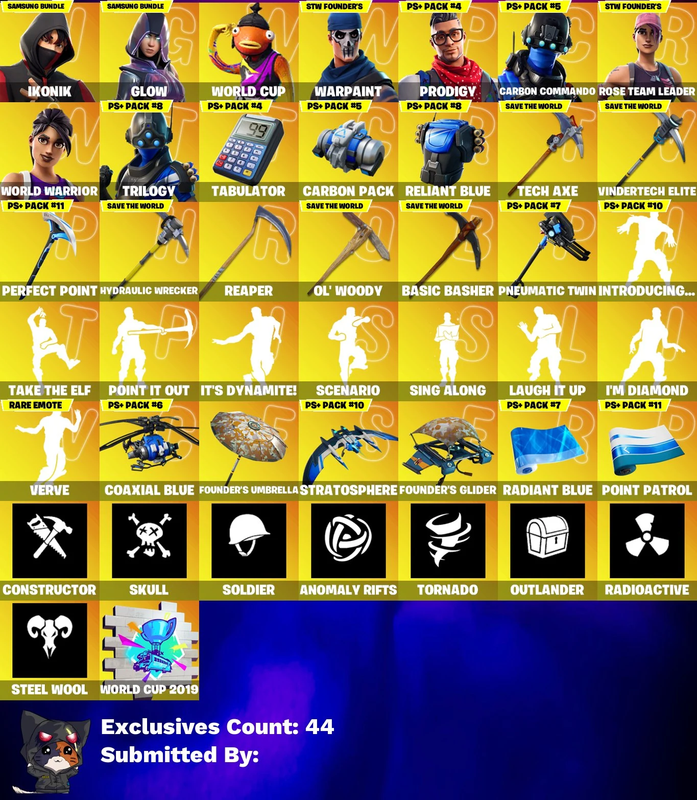 💥🌟 EXCLUSIVE OFFER 🌟💥 140 SKINS 💎 IKONIK 💎 Glow 💎 Scenario 💎 WORLD CUP 💎 Prodigy 💎 Carbon Commando 💎 World Warrior 💎 Trilogy 💎 Malice 💎 Omen 💎 Sentinel 💎 Catalyst 💎 Dark Vanguard 💎 Ultima Knight 💎 OG STW 💎 FULL ACCESS 💎