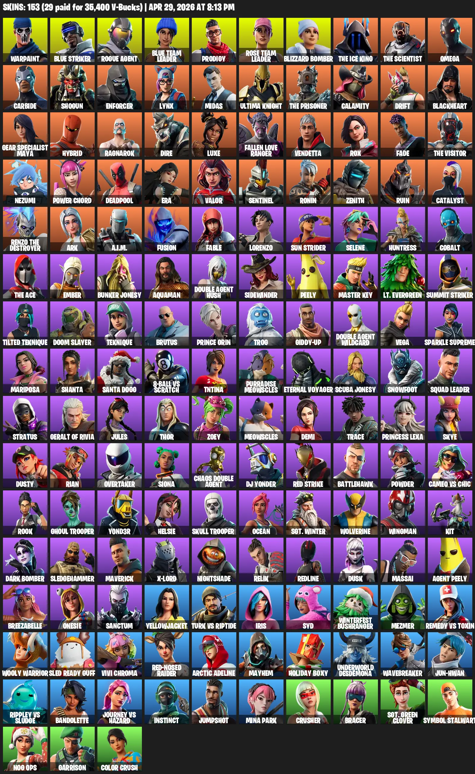 [PC] | 153 skins | OG STW | Omega | Reaper Axe | Warpaint | Blue Striker | Rogue Agent | Blue Team Leader | Prodigy | Rose Team Leader | #COS8226