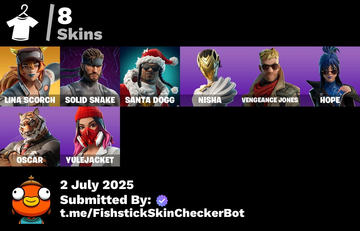 [PC] 8 Skins | Lina Scorch | Solid Snake | Santa Dogg | Nisha | Hope | Vengeance Jones | Oscar | Yulejacket | Ruby Relic | Twin Blasters | FN23
