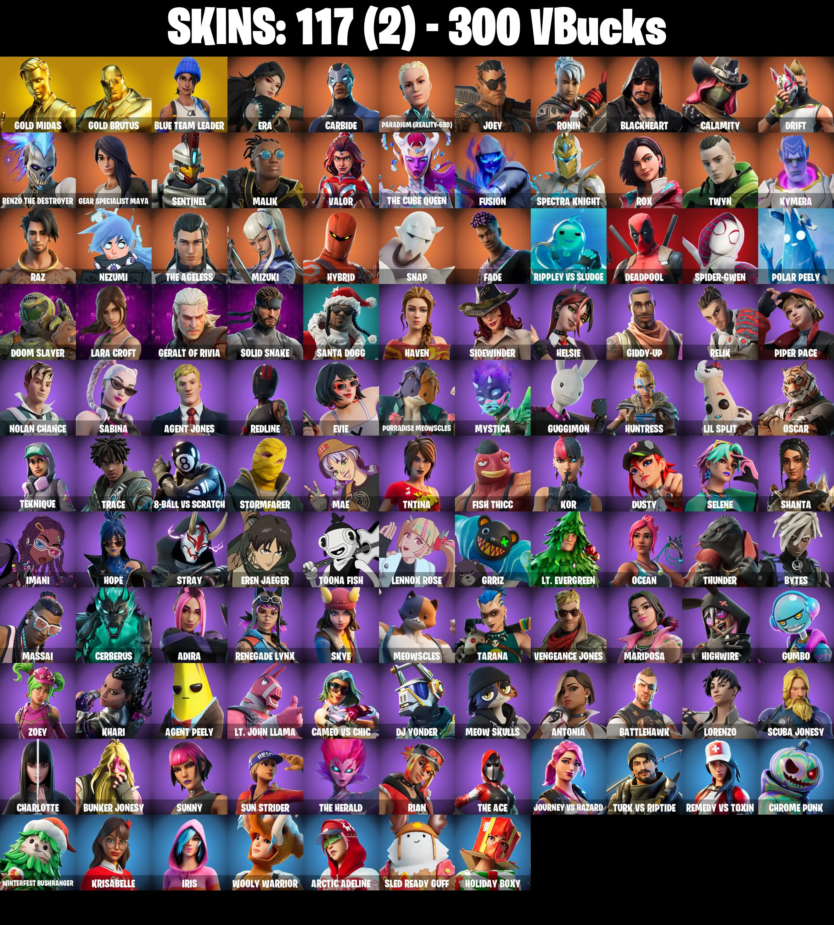 PC/PSN/XBOX ♨️117 skins ✨ Lara Croft ✨ Deadpool ✨ Gold Midas ✨ Gold Brutus ✨ Spider-Gwen ✨ Orange Justice ✨ Drift ✨ Carbide ✨ Fusion ✨ #B843
