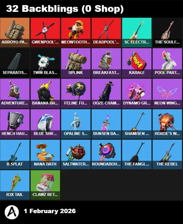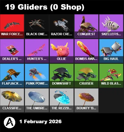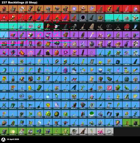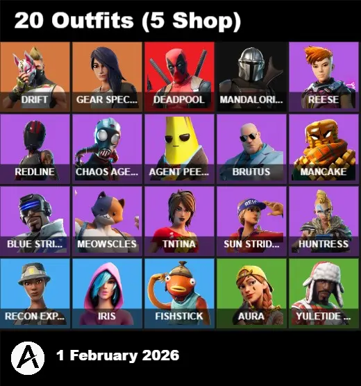 | PC/PSN/XBOX | 20 Skins | Drift | Gear Specialist Maya | Deadpool | Mandalorian | Reese | Redline | Chaos Agent | Agent Peely | Brutus | Mancake | Blue Striker | Meowscles | TNTina | Sun Strider