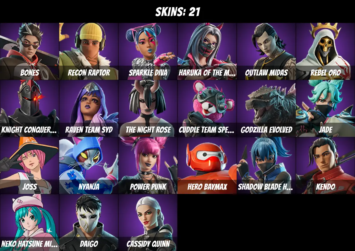 ⚡PC/PSN/XBOX⚡ 21 skins 💎 Go Mufasa 💎 Baymax Wings 💎 Bones 💎 Recon Raptor 💎 Sparkle Diva 💎 Haruka of the Masks 💎 Outlaw Midas 💎 Rebel Oro 💎 Knight Conqueror 💎 Raven Team Syd 💎 The Night Rose 💎 Cuddle Team Specialist 💎 Godzilla Evolved 💎 Jade 💎 0 V-Bucks 💎
